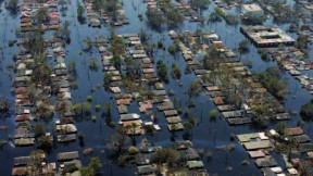 Floodwaters engulf a residential neighborhood in New Orleans after the levee holding Lake Pontchartrian broke in the aftermath of Hurricane Katrina.