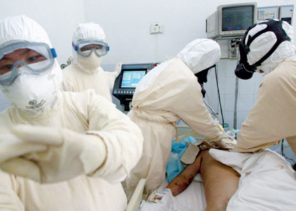Chinese doctors and nurses wear protective gear as they tend to a SARS patient in a Beijing hospital. |