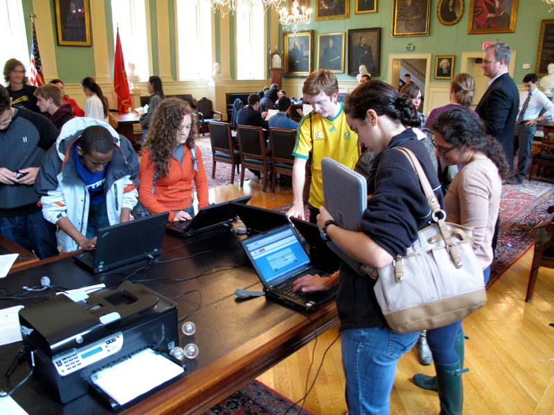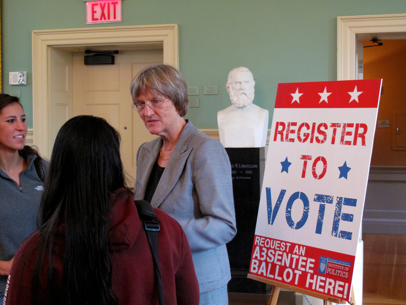 President Drew Faust, on hand at University Hall to watch students register, likened it to “drive-in voting.” “Put the opportunity to vote right next to something freshmen have to come in to do, so it reminds them of the opportunity,” she said. “Both the people I just spoke to are registering for the first time, so that’s very meaningful....I think a liberal-arts education is meant to educate people in a variety of ways, and I think one of those ways is the responsibility to vote.”