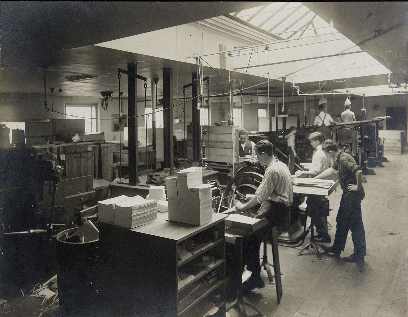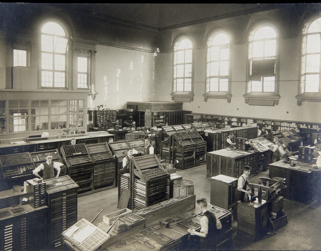 The press moved into another building in the Yard and clattered busily, turning out books and pamphlets and other matter for the College and for outside customers until Harvard abandoned the effort in 1692. In 1802, the President and Fellows voted to establish a printing office to print for and at the direction of the University, but sold the operation in 1827. Harvard’s third printing venture came in 1872 with the establishment of a printing office and, in 1892, a publication office, both in University Hall in the Yard. They later moved to more spacious quarters in Randall Hall, on the site where William James Hall stands today like an immense big toe. See the presses there, above, and the composing room, opposite. Publication staff sat on a balcony behind a glass partition overlooking the compositors. (Printing and publishing would split apart organizationally in 1942.) In 1913, the publication office became Harvard University Press. It celebrates its centennial this year with various undertakings:
