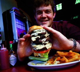 | Walker with the "Riley Burger," which he inhaled in four minutes flat |