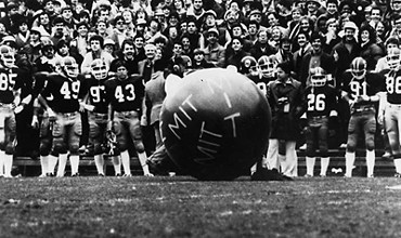 November 20, 1982. The sudden mushrooming of a menacing black balloon on the field at halftime rocks the Stadium crowd; unfazed by this MIT prank, Harvard rocks Yale, 45-7. Never has a Crimson team scored so many points against the Eli.