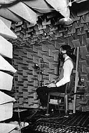Beranek (above, left) and his team had two challenges: to quiet the planes themselves to cut the noise fatigue faced by their crews, and to compensate for the fading strength of the human voice at high altitudes. Because the planes then in use were unpressurized, each crew member wore an oxygen mask, and above 30,000 feet, voice communication through the masks was impossible. The Electro-Acoustic Lab's anechoic chamber (above, right), nicknamed "Beranek's Box."