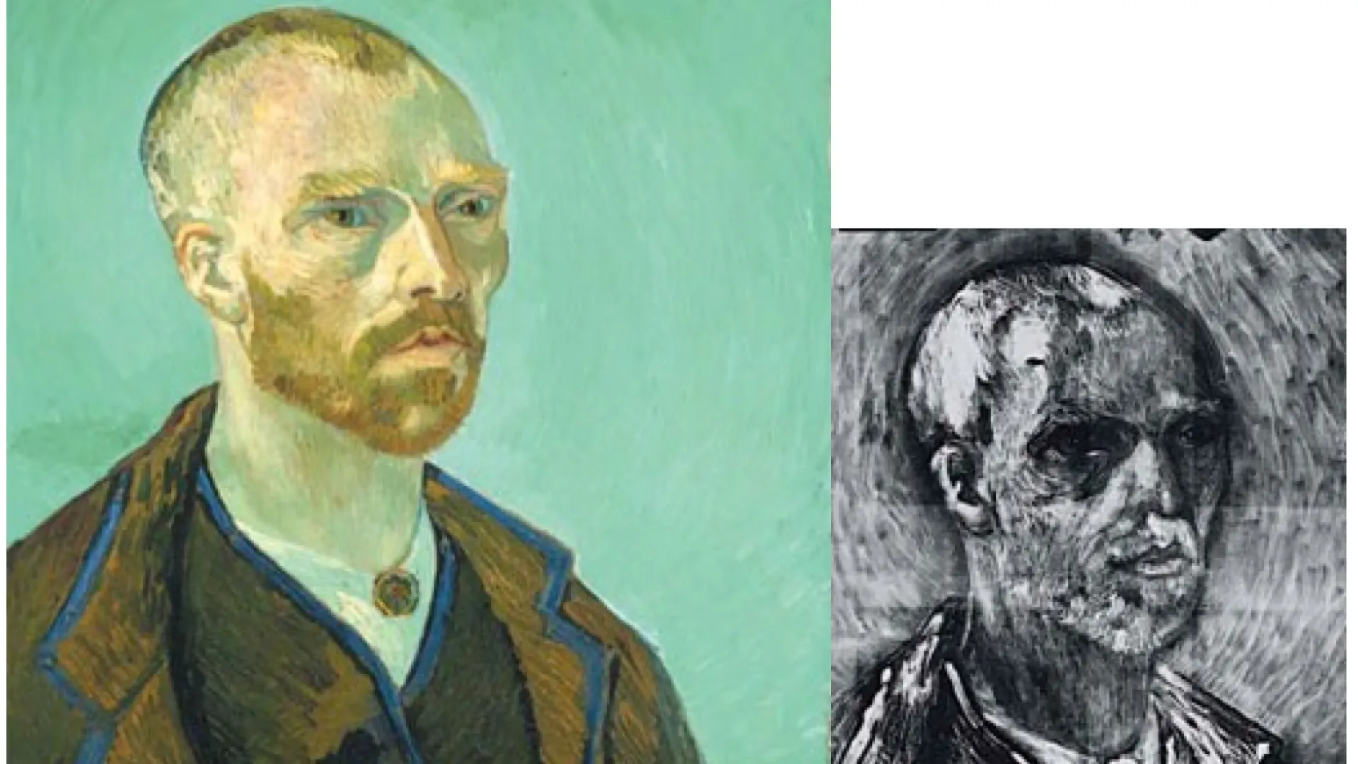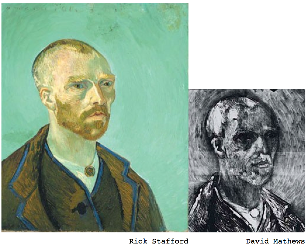The drawing of the face strikes Cooper as clumsy in a number of ways. "There's something odd about the far side of the face, which is the harder side to do because it's curving away in perspective. The way the pipe enters the mouth, the way the mouth is crushed around the pipe, and the 'v' of the lips don't quite seem right. The nose is a little too beaky. The eyes have a slitty, deeply set look, which I don't think you see in Van Gogh's self-portraits. There's something literally and figuratively mean about those eyes. Whatever his craziness, Van Gogh's face generally has some sympathy and pathos to it, and you don't see it very much here."