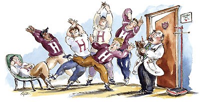 1920 A physical examination of all 700 first-years, in connection with a new system of compulsory freshman athletics, has classified each student according to "bodily mechanics" (posture). Only 7.5 percent demonstrated "good mechanical use of the human body"; 12.5 percent were "fairly good"; a full 55 percent exhibited "bad use." The 25 percent who demonstrated "very bad mechanical use" must do special exercises until they show improvement.