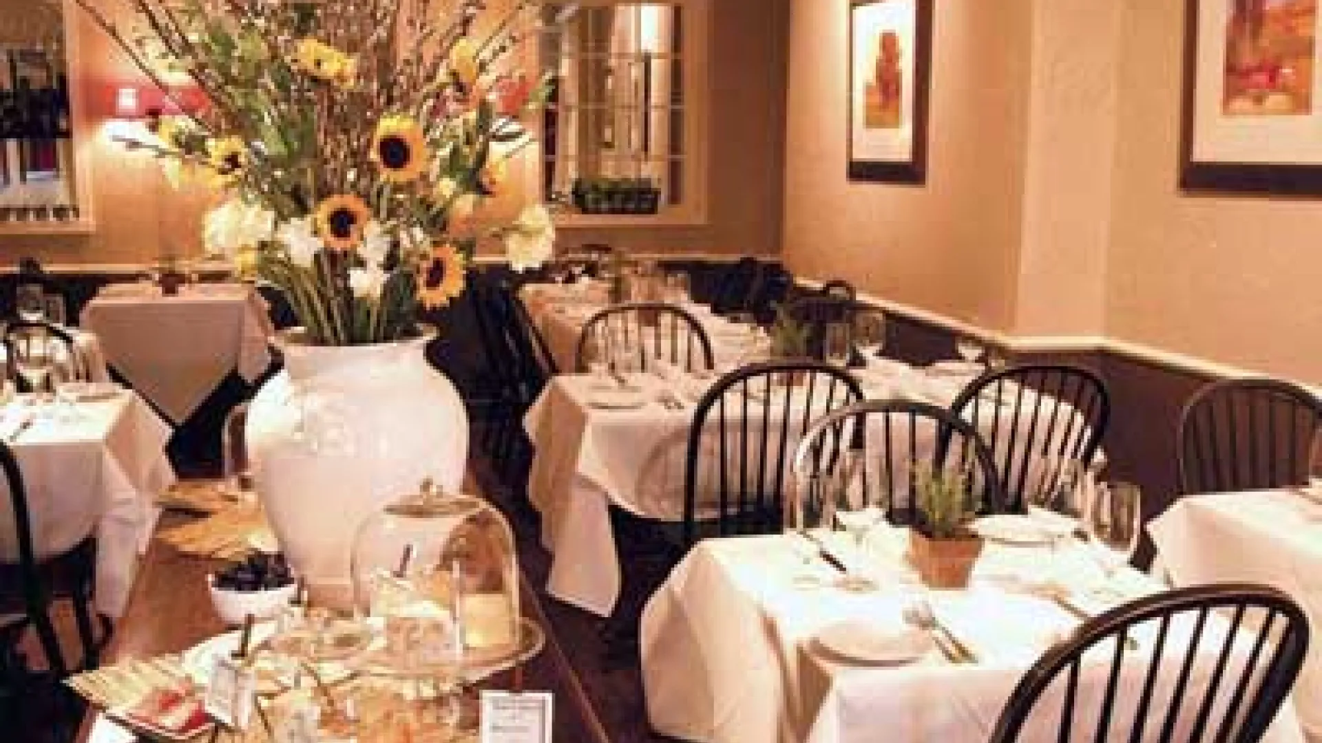 It’s French with an American accent. Appetizers we sampled included veal sweatbreads in a robust molasses butter, with radishes and micro sorrel ($14); agnolotti pasta stuffed with Robiola Due Latte cheese, with braised rabbit, white true, lovage (celery on steroids), and peas ($15); and a salad with (the mildest of greens) mache, chèvre, and toasted hazelnut vinaigrette discreetly accompanying a juicy pear ($9). Among the entrées were an astonishingly tender ballotine of chicken (ballotine means “boned, stuffed, rolled, and tied in the shape of a bundle,” says the Epicurious dictionary), with “apricot white bean purée, sage leaf tempura, cocoa, and citrus brown butter” ($28). The roast wild salmon kept company in a tiny sea of smoky consommé with corn flan ($29). The beef tenderloin ($34) came with “red wine prune purée,” and it always should. Only the “free range organic lamb loin” ($36) disappointed slightly: flavorful, but it seemed to have gotten a mite chewy out there on the range.