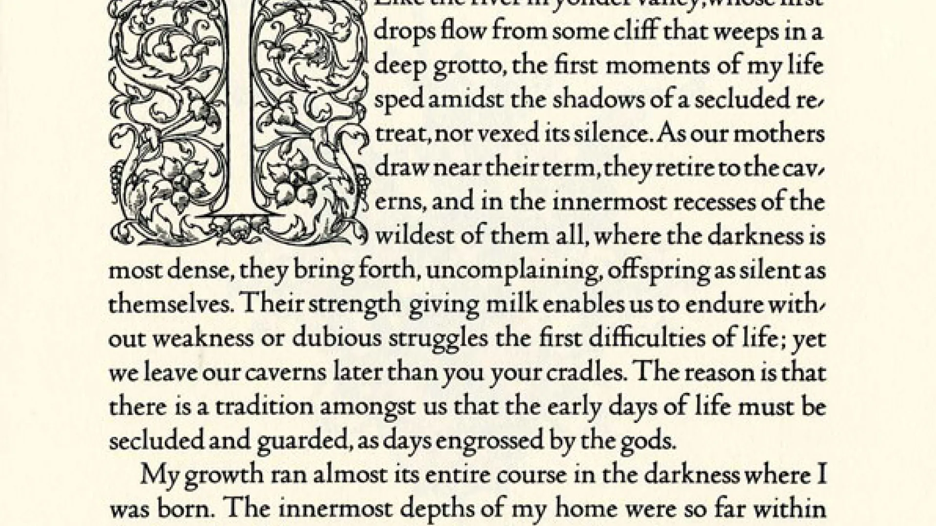 Rogers had come to Boston in 1895 and was hired in 1896 by Houghton Mifflin to design trade books and advertisements at its Riverside Press in Cambridge. In 1900 a special department was established for the design and production of limited editions for sale to collectors. Rogers ran it until 1912. He designed his first type for the printing of a three-volume folio edition, The Essays of Montaigne, which was in the works for three years, 1902 to 1904. He had seen a copy of Nicholas Jenson's 1470 printing of a work by Eusebius in an exhibition at the Boston Public Library and been much taken by its typography. He copied Jenson's letter forms as closely as he could for his new typeface, named Montaigne after the book in which it was first used, as was the typographic custom. But he was never wholly pleased with the cutting of Montaigne. He used the same Jenson model for Centaur, cut a dozen years later, and was satisfied with it.