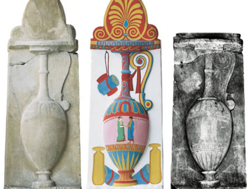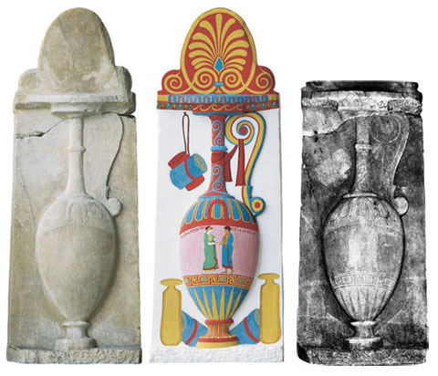 The color reconstructions are based on close examination of the originals and on scientific analysis of the scarce traces of paint remaining on them. Ultraviolet light, says Ebbinghaus, “brings out ‘paint ghosts,’ differences in the surface structure of the stone caused by different paints and by the weathering of the paints. It can often give you an idea of patterns, even if no pigments survive.” The paint on these reproductions of stone sculptures appears flat, lacking the depth of, say, oil. “We can identify the colorants—mostly minerals and some plants,” says Ebbinghaus, “but binding media are hard to identify. Egg has been used for the reconstructions. If the minerals were ground more finely, a different binding medium used, the paint polished or covered with a protective coating, the effect would be quite different.”