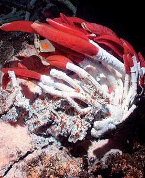At the bottom of the sea, life for these giant tubeworms is made possible by symbiotic bacteria that convert chemicals ejected from hydrothermal vents into food, in a process called chemosynthesis.
