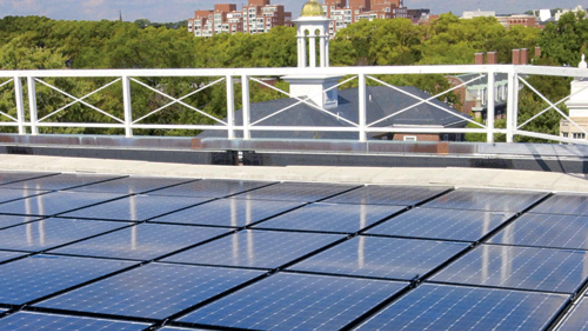 Harvard is already trying many green initiatives; it will need to do much more to meet its new greenhouse-gas emissions goal. Above: solar panels on the roof of the Business School’s Shad Hall.