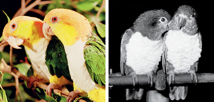 What humans see of the world is not all there is to see. An interactive computer display allows us to see how a deer, a whale, a bee, a fish, and a bird might perceive the world. Although we cannot visualize all that a parrot sees, for example, we can note how ultraviolet light, which it does detect, changes the emphasis of plumage on these two white-bellied caiques, Pionites leucogaster, perhaps evaluating each other as potential mates.