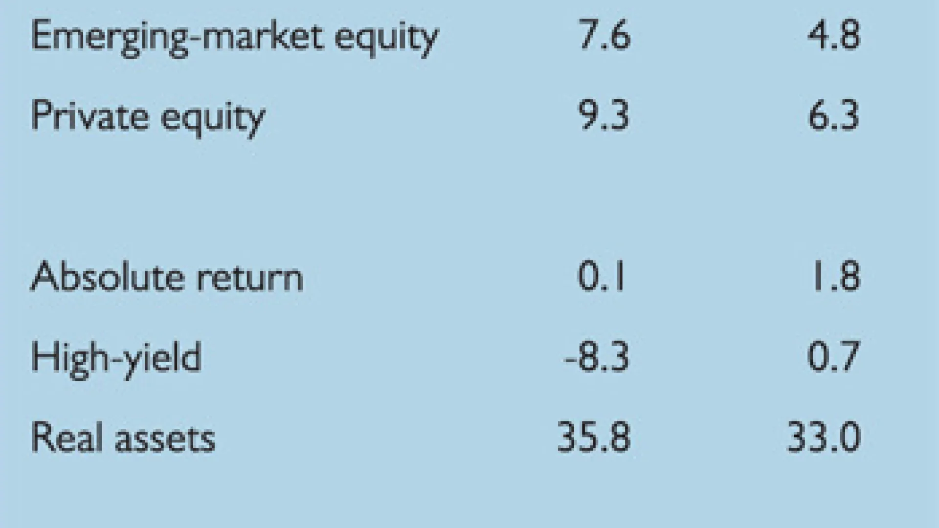 In seven investment classes, HMC results exceeded those for the appropriate market benchmarks: domestic, emerging-market, and private equities; real assets (including all three subcategories of commodities, timber and agricultural land, and real estate); and domestic, foreign, and inflation-indexed bonds. In three classes, HMC performance fell short of market benchmarks: foreign equities, absolute-return funds, and high-yield assets. (See chart at left for returns by asset category. The University’s annual financial report, released in late October and covered on page 68 of this issue, further details performance by class in its narrative on HMC.)
