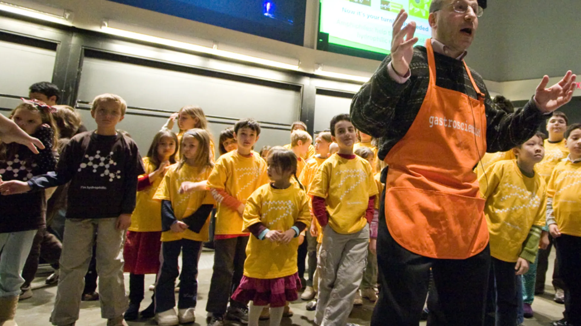 Chocolate's two main ingredients, cocoa powder and cocoa butter, don't combine easily into a smooth mixture, they pointed out. A hands-on demonstration underscored this point: one-third of the children were dressed in brown T-shirts, one-third in yellow, and one-third in white shirts with a printed design in both yellow and brown (all souvenirs handed out at the start of the lecture). As Stone gave his young volunteers instructions, the significance of the T-shirt colors became apparent: those wearing brown were cocoa solids; those in yellow, cocoa butter; and those in the multicolored shirts an emulsifier—such the soy lecithin found on the ingredient list on many chocolate labels. Following Stone's instructions, each emulsifier molecule took the hand of one cocoa-powder molecule and one cocoa-butter molecule.