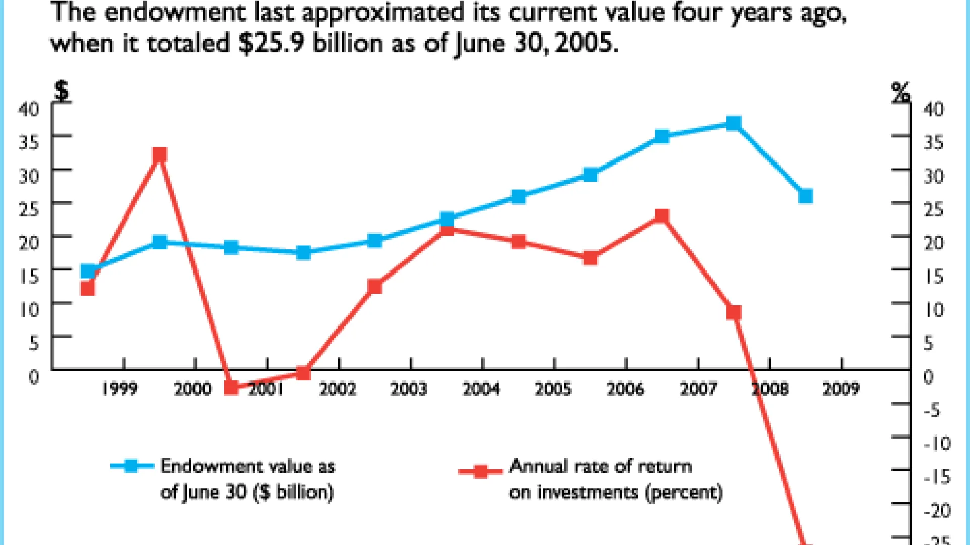 Harvard’s endowment was valued at $26.0 billion as of June 30—29.5 percent less than the record $36.9 billion at the end of the prior fiscal year. That result reflects a negative 27.3 percent investment return on endowment assets after expenses and fees; plus capital gifts received; minus the distribution of about $1.7 billion from the endowment to support University operations during the year. The latter amount represents an increase over the funds distributed in fiscal year 2008; details presumably will be forthcoming with the publication of the annual financial report (See October 16 online update, published after this issue went to press: "Harvard's Annual Financial Report Fully Details 2009 Losses"). Reduced endowment distributions in the current and next fiscal years, mandated by the Harvard Corporation in response to the investment losses, are driving cost-cutting throughout the University.