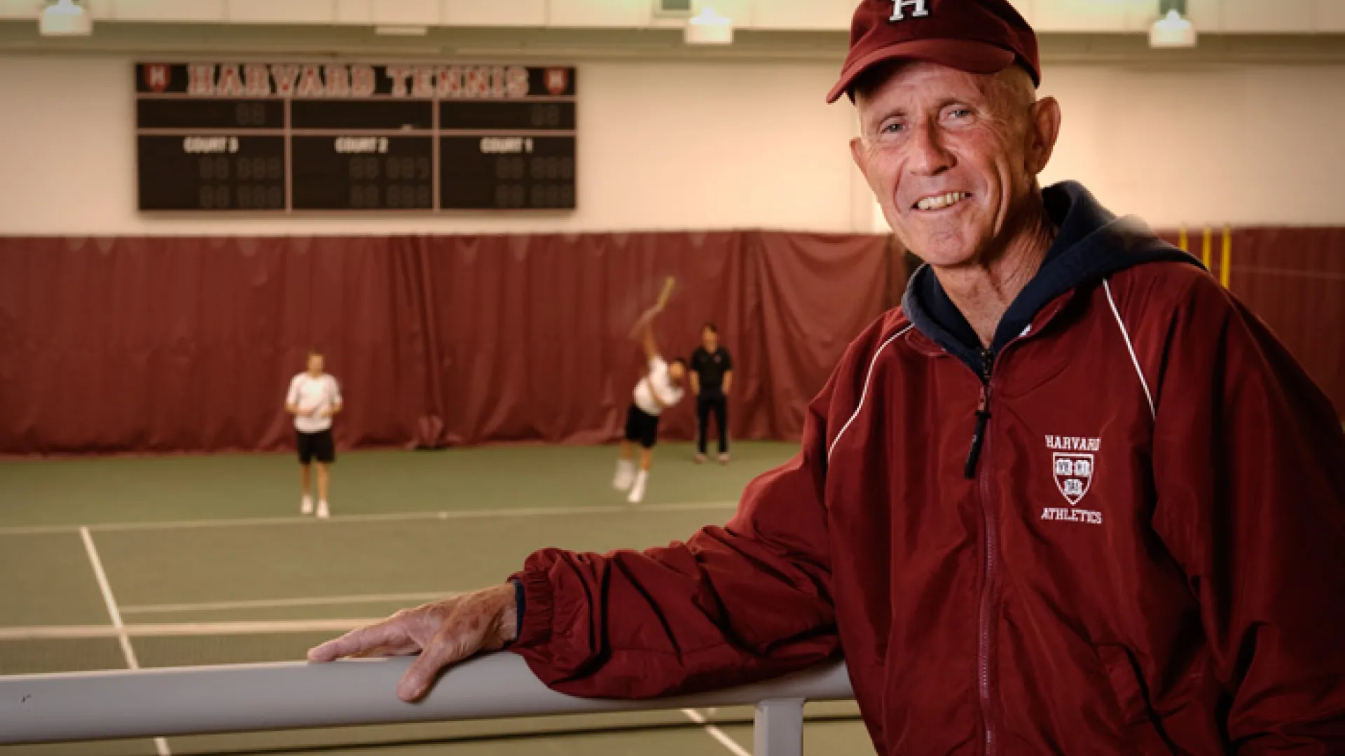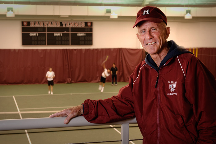Wright spent years watching a “huge amount of tennis on videotape” and, through study and experimentation with players, determined that this “high set” (high center of gravity) confers several major advantages. The high set results from “trying to stand as tall as possible,” Wright says, “moving while minimizing flexion of the knees and waist.” Doing so, he says, makes players quicker to the ball, improves their stamina (as it is less fatiguing than a “low set”), and puts less overall strain on the body, making injuries, especially knee injuries, less likely. As a 66-year-old volunteer assistant coach at Harvard, he’s now working with Dave Fish, head men’s tennis coach since 1976, and assistant coach Andrew Rueb to bring this innovative concept to the Crimson varsity.