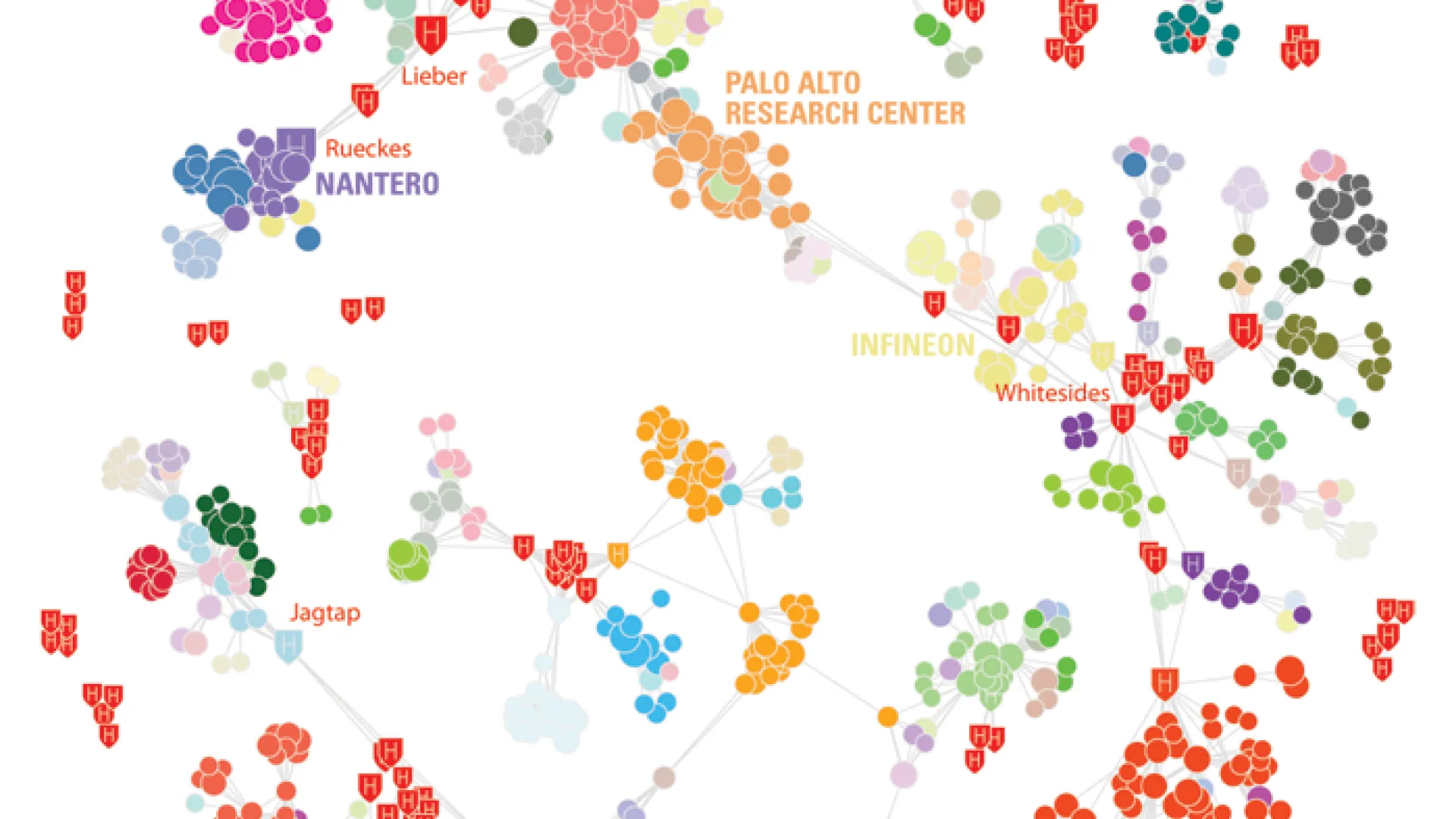 At a basic level, this map illustrates the global connections of Harvard inventors. They collaborate not only with each other, but with the distinguished Palo Alto Research Center in California; the multinational General Electric; and the Yeda Research Institute in Israel. They collaborate in a variety of domains: nanotechnology (Nantero), electronics (Infineon Technologies), and pharmaceuticals (Vertex).