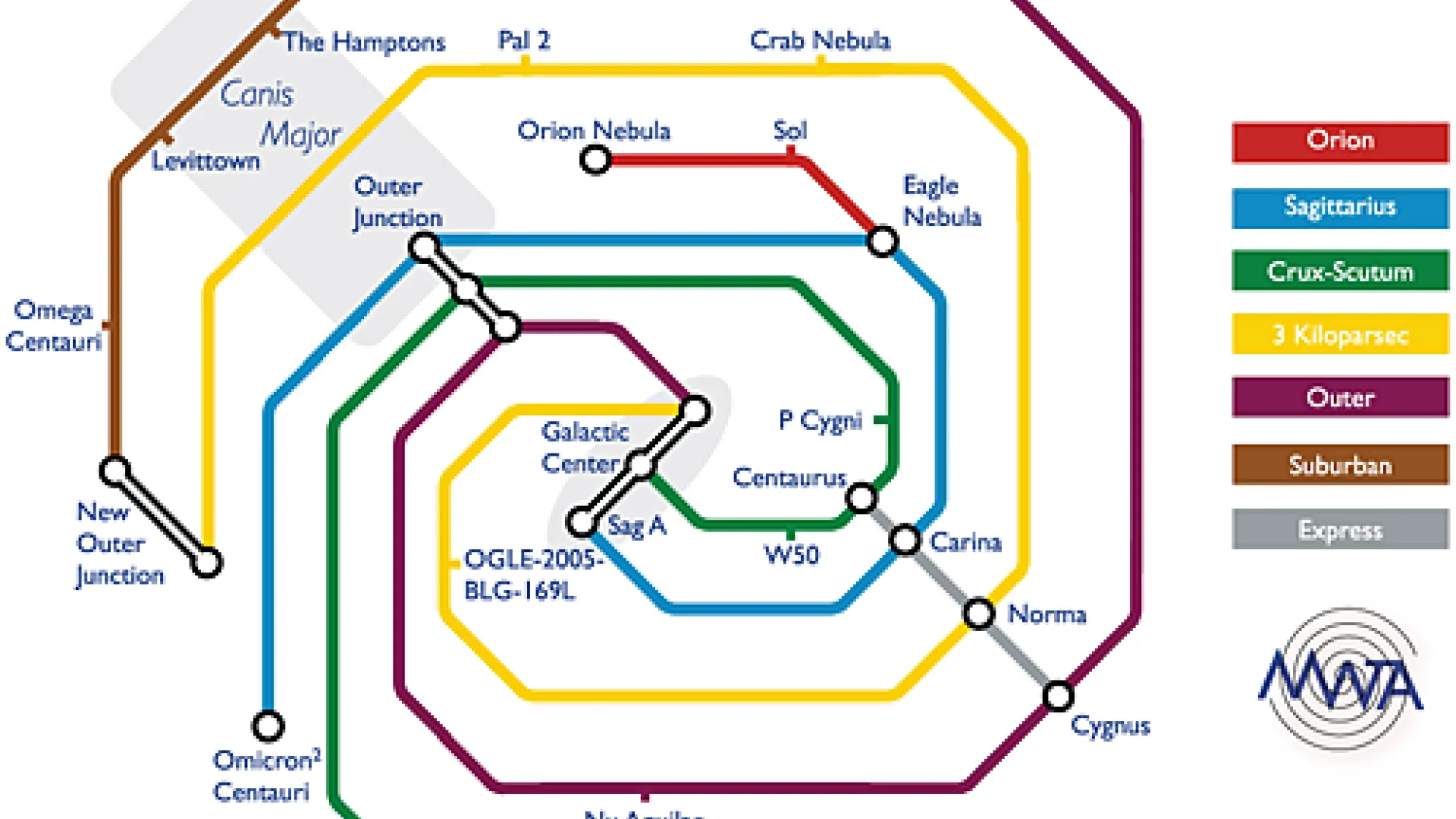 For his own map, Arbesman used the coloring and formatting of the London Tube (the “ur-map” of subway systems, he notes) as a template to show the routes an interstellar traveler would take to hop between stars. Each rail line on the map represents a spiral arm of the galaxy, and stations are thousands or tens of thousands of light years apart. There are some inside jokes: Levittown, “the quintessential suburb,” is one of the stops in the galactic boonies. Likewise, “our own solar system is way out in the suburbs,” he says, at the station called “Sol.”