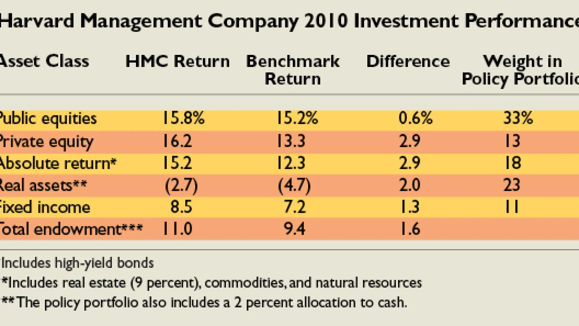 In both years, the University’s portfolio fared less well than a popular measure of large endowment funds, the Trust Universe Comparison Service. Median performance for the TUCS in fiscal 2010 was a 13.3 percent investment return, 2.3 percentage points above the HMC results. The difference reflects dissimilar asset allocations. As HMC president and chief executive officer Jane L. Mendillo explained subsequently, TUCS funds are about half invested in public equities (versus one-third for HMC’s portfolio--where they were among the better performing holdings), with only a few percent invested in real assets (typically almost one-quarter of HMC’s allocation--and this year, the only segment where it recorded losses). Among peers, Columbia reported a 17 percent investment gain, Penn 13 percent, Dartmouth 10 percent, and Brown and MIT both 10.2 percent. Among schools with portfolios most comparable to HMC’s, Yale gained 8.9 percent and Stanford 14.4 percent.