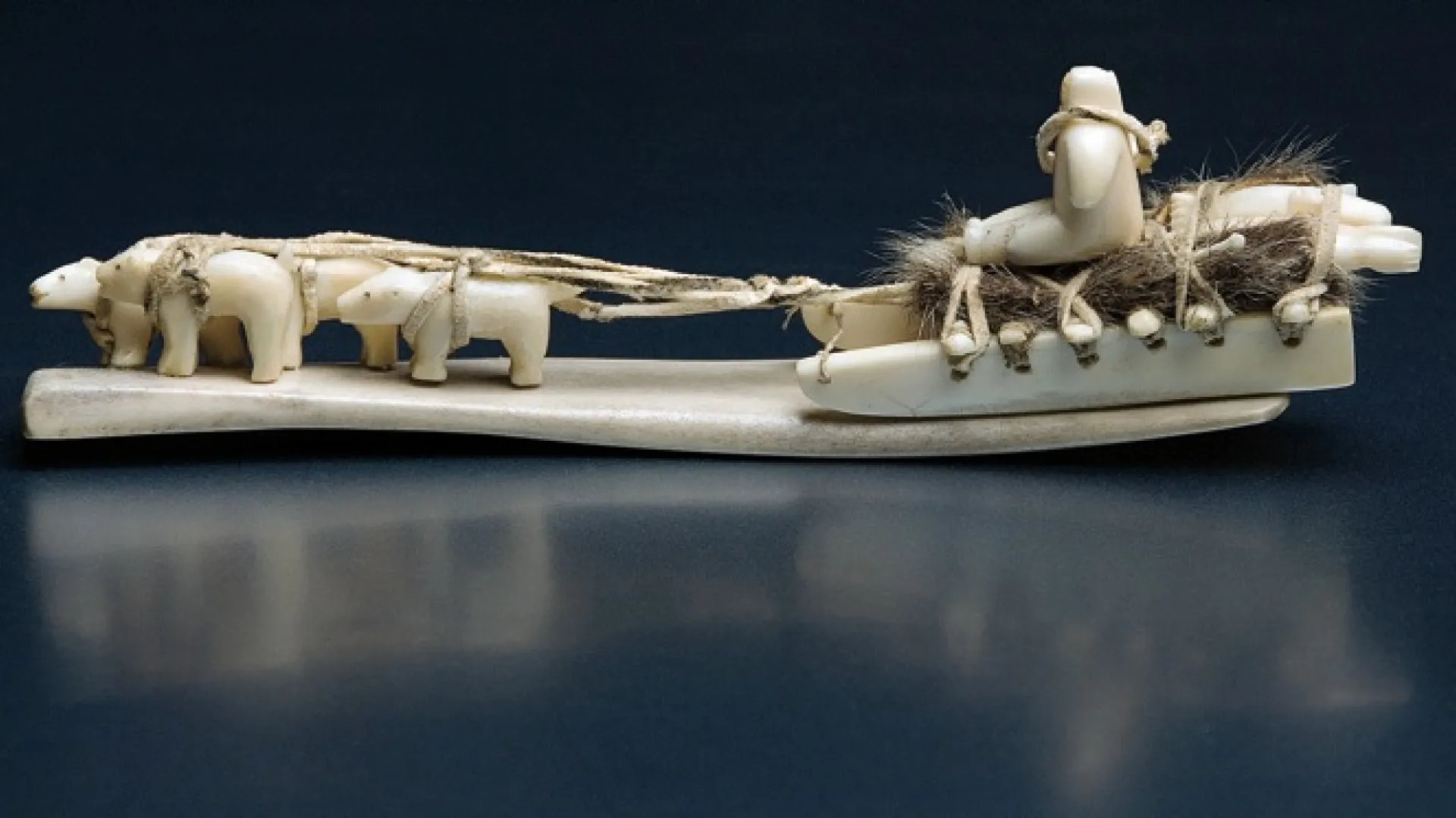 The piece shown here was made in Kugaaruk of carved ivory, leather, and sealskin. It is 7 3/8 inches long. This community was “especially well known for its carvings of small ivory figures and tableaux representing the daily lives of the Inuit,” says Lutz. “As with many of these objects, which were used as items of both trade and sale as early as the nineteenth century, we do not know the identity of the artist.” This dogsled, she adds, “depicts a way of life that most Inuit living today have only heard about.”