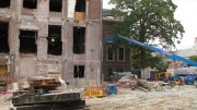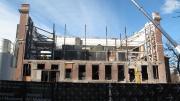 As reported, the wholesale remaking of Harvard’s central art-museum complex has begun. The accompanying photo gallery, begun in late January and since updated continuously, shows scaffolding erected on the Prescott Street side of the Fogg complex, giving construction workers access to the roof to remove stone balusters. Along Broadway, the loading dock (used to remove artworks for storage) was demolished, creating space to remove construction debris from the interior demolition. The windows are giving way to plywood, and the front entrance, on Quincy Street, has been blocked off.