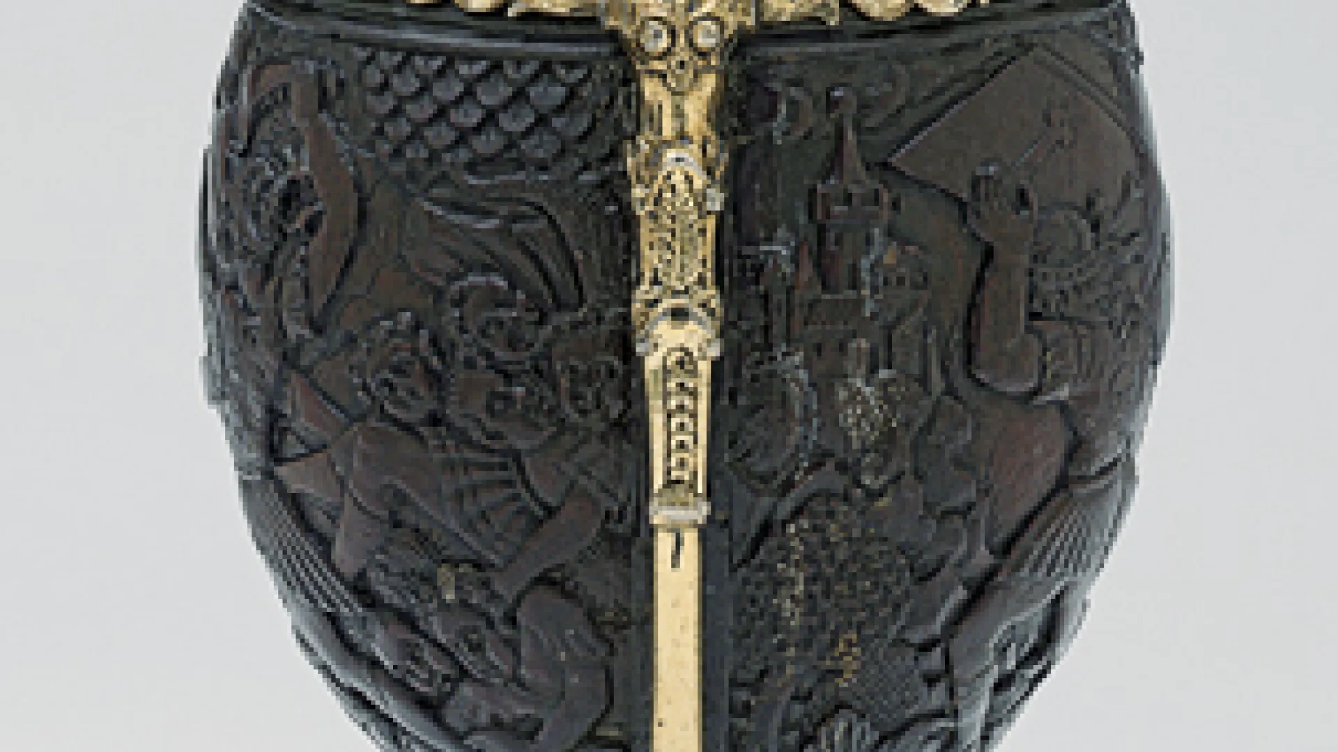 Quaffers today may never have imagined such a thing as a goblet made from a coconut and gilt silver, but about four centuries ago cups such as the one shown here were well known to a species of European collector. These vessels were often displayed in a so-called cabinet of curiosities, or Wunderkammer, usually room-sized, containing a hodgepodge of remarkable items ranging from preserved animals, skeletons, minerals, alleged mermaids, and the tusks of narwhals (but said to come from unicorns), to wondrous man-made objects: ethnographic specimens from exotic locations, antiquities, clockwork automata, paintings, sculptures. Some 1,500 coconut goblets from the early modern period survive. Danielle Charlap ’09 wrote an 87-page undergraduate history honors thesis about them, entitled “Chasing Wonder: Coconut Cups Collected in Europe, 1500-1700.” She examined in particular this one, from the Harvard Art Museums/Busch-Reisinger Museum. Hans Peter Müller, a silversmith active in Breslau, Germany, fashioned it around 1600.