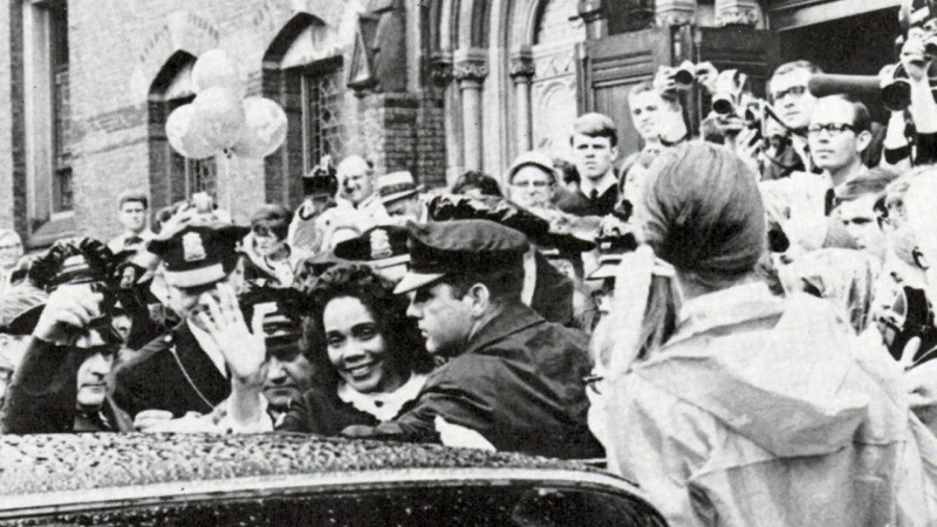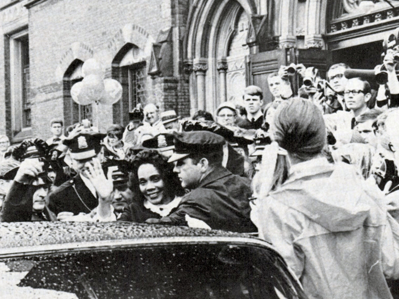 The Harvard class of 1968 invited Dr. Martin Luther King Jr. to address them on Class Day, and the civil-rights leader accepted. After his assassination on April 4, his widow agreed to speak in his stead. A standing-room-only audience, crammed into Sanders Theatre because of heavy rain, heard Coretta Scott King speak of the need for the younger generations to “hold high the banner of freedom.” Discussing the impact of contemporary student activism from the United States to Czechoslovakia, she declared that the generation gap "is a positive thing if it separates evil ideologies and customs of the past from the freedom spirit that animates much of the contemporary student movement." In struggling to give meaning to their own lives, she told her audience,