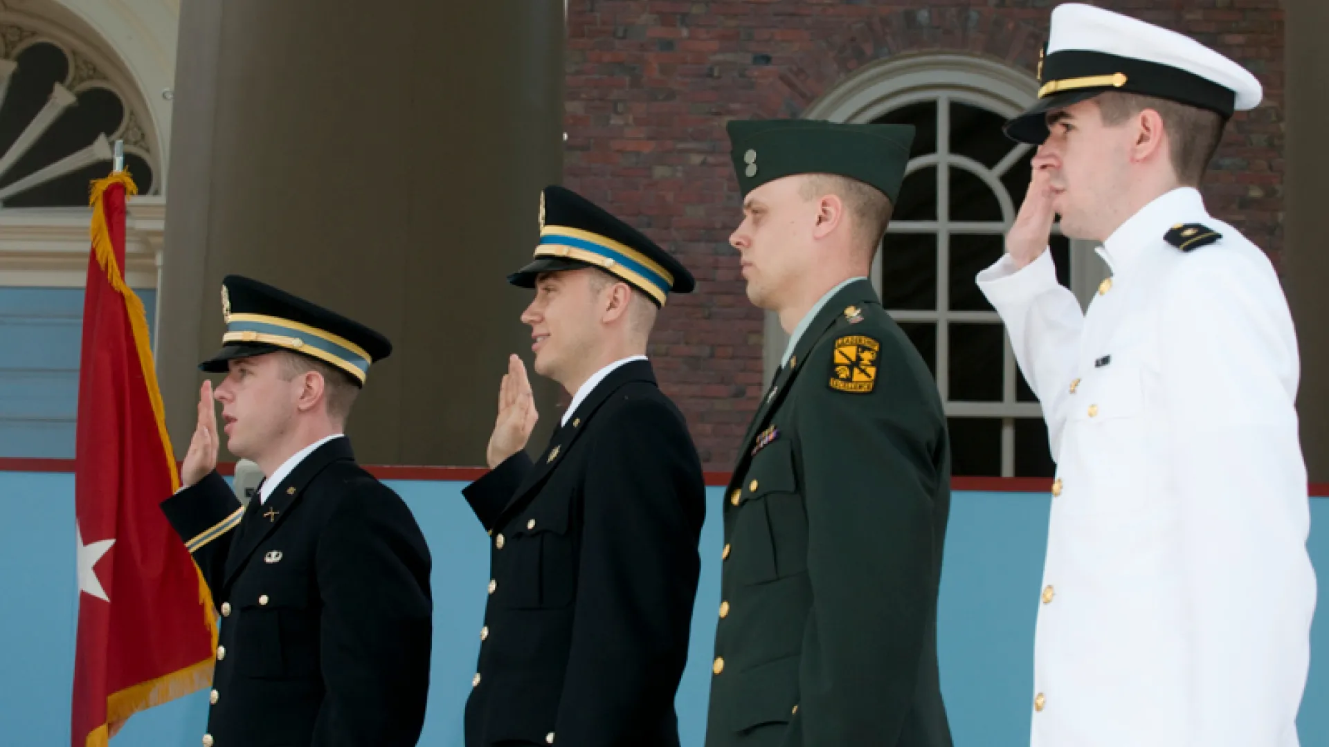 Before proud parents, friends, and a contingent of alumni veterans, four new “Harvard soldier scholars,” in the words of President Drew Faust, participated in the annual commissioning ceremony in Tercentenary Theatre on Wednesday morning, May 25—the first since the announcement that the Naval Reserve Officers’ Training Corps would return to campus after the repeal of the “Don’t Ask, Don’t Tell” policy. President Faust alluded to that significant change when she told the new officers, “I hope that your place in a long and newly invigorated Harvard tradition of military service and sacrifice supports and inspires you in the months and years to come.”