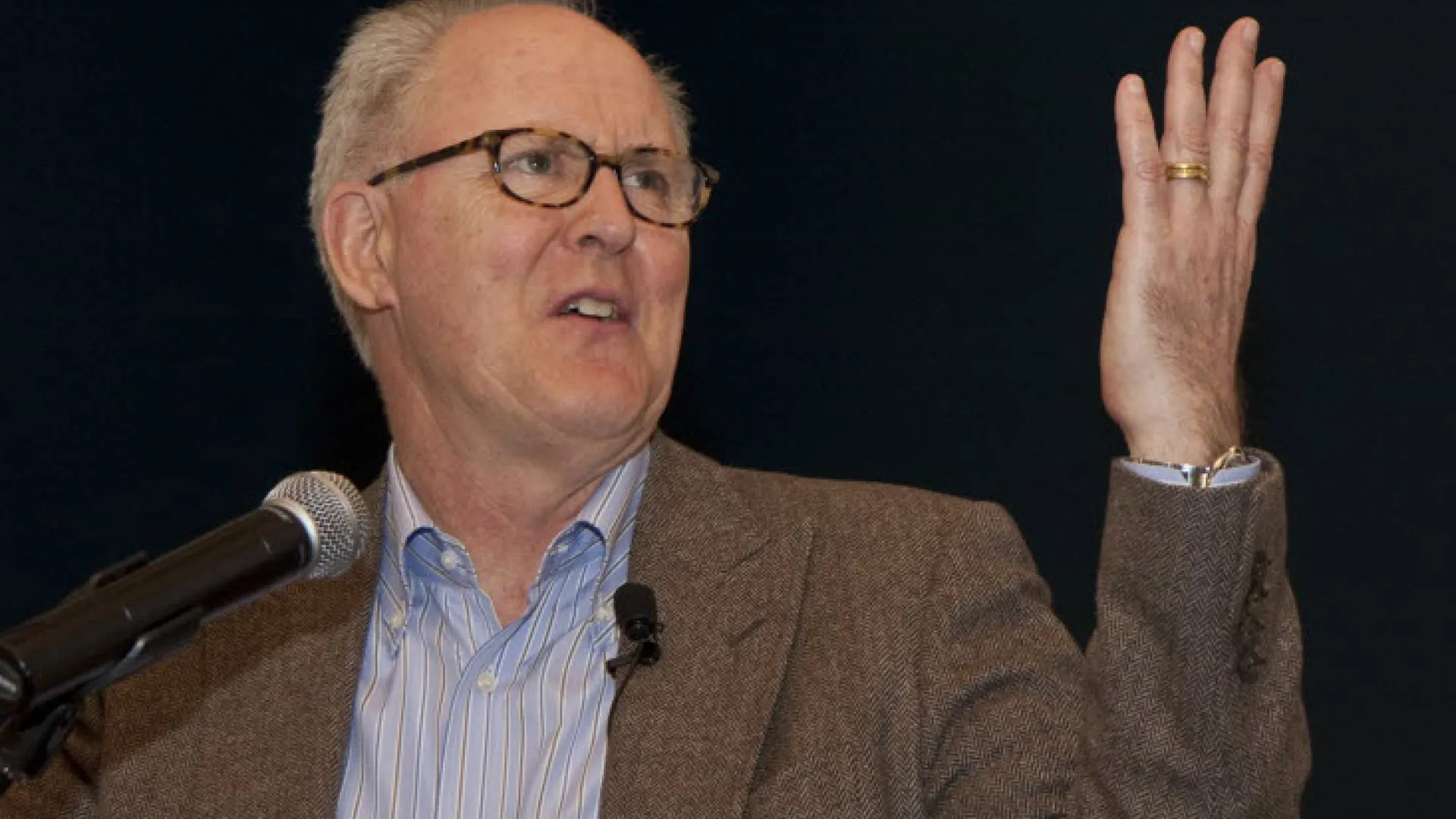 In his presentation, he invites the audience to try the "hoary old Actors' Studio exercise called 'sense memory' " and thus recall "the eureka moments of discovery, creativity, and joy that created in you the habit of learning." Lithgow relives a time his his own childhood, ninth and tenth grade years spent in Akron, Ohio, where he had the "extraordinary luxury" of beginning every school day with two periods of art. "Art would launch me into the rest of my day with a heady creative rush," he declares. "The expressive energy of those art classes served as a kind of booster rocket to my entire educational career."
