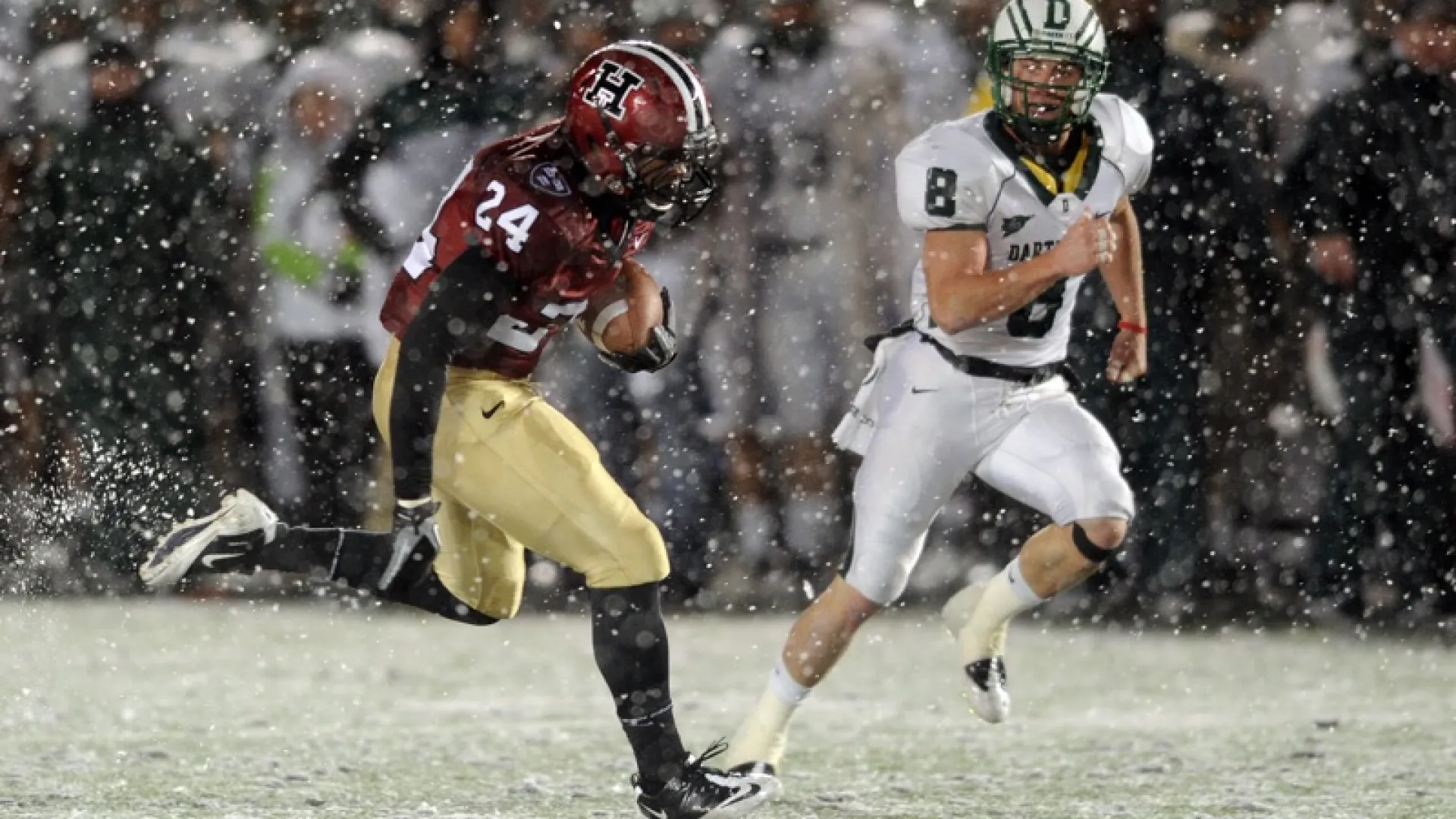 The defense confined the Dartmouth ground attack to 104 yards rushing, and allowed just 98 yards through the air. Despite the weather conditions, neither team gave up a fumble or an interception.