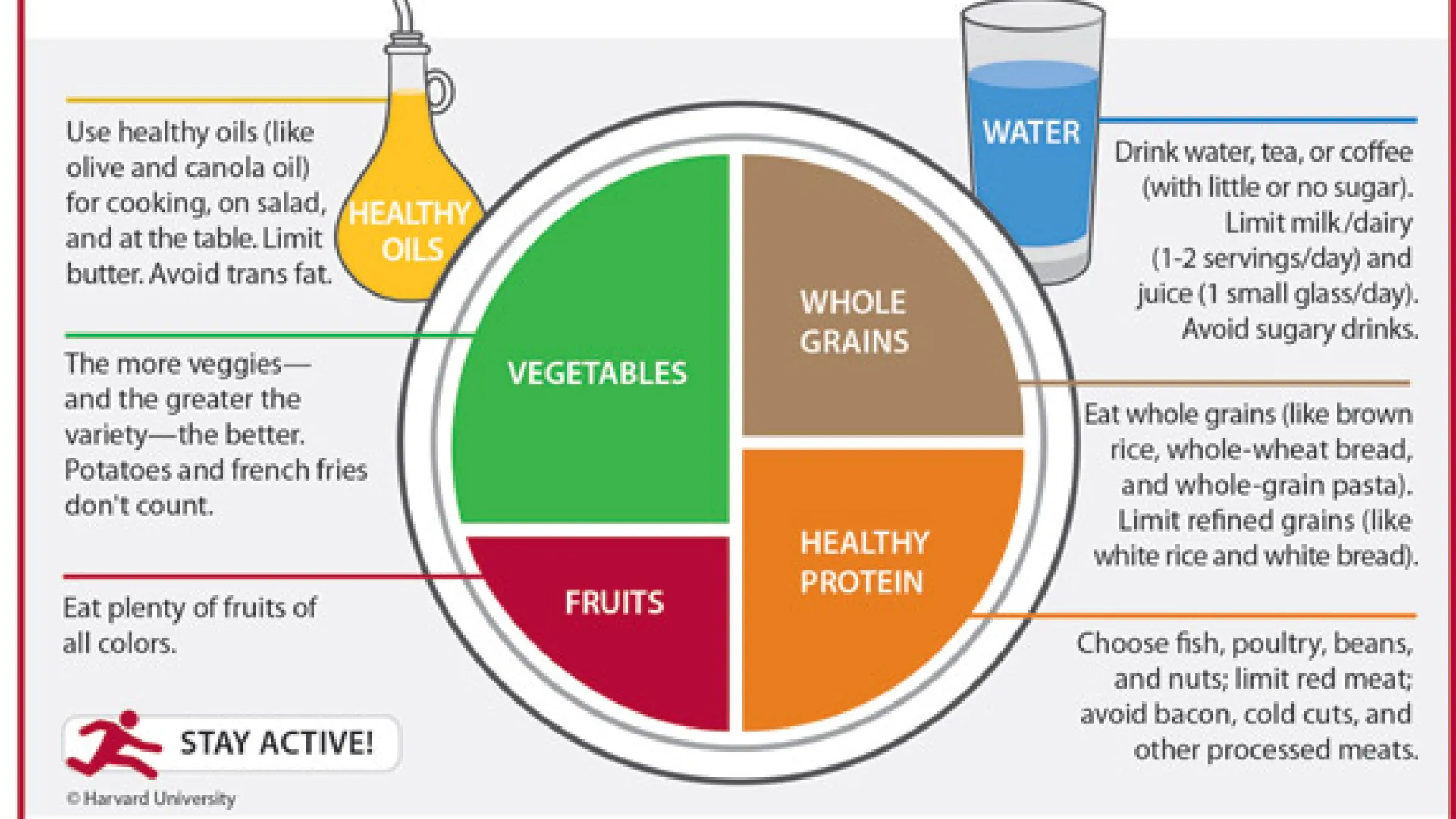 While Harvard's plate also has the same four sections, it offers more detailed information on what foods to eat, and which ones to avoid. For example, in place of the grains section, the Healthy Eating Plate includes a whole grains section. Other differences include an explanation of what proteins are healthy—poultry, fish, beans and nuts—emphasizing the need for healthy fats, such as the heart-healthy omega-3 fatty acids in fish, and the fiber in beans. Harvard's plate also replaces milk with water and recommends only one to two servings a day of low-fat milk, since high intake levels are associated with increased risk of prostate cancer and possibly ovarian cancer.