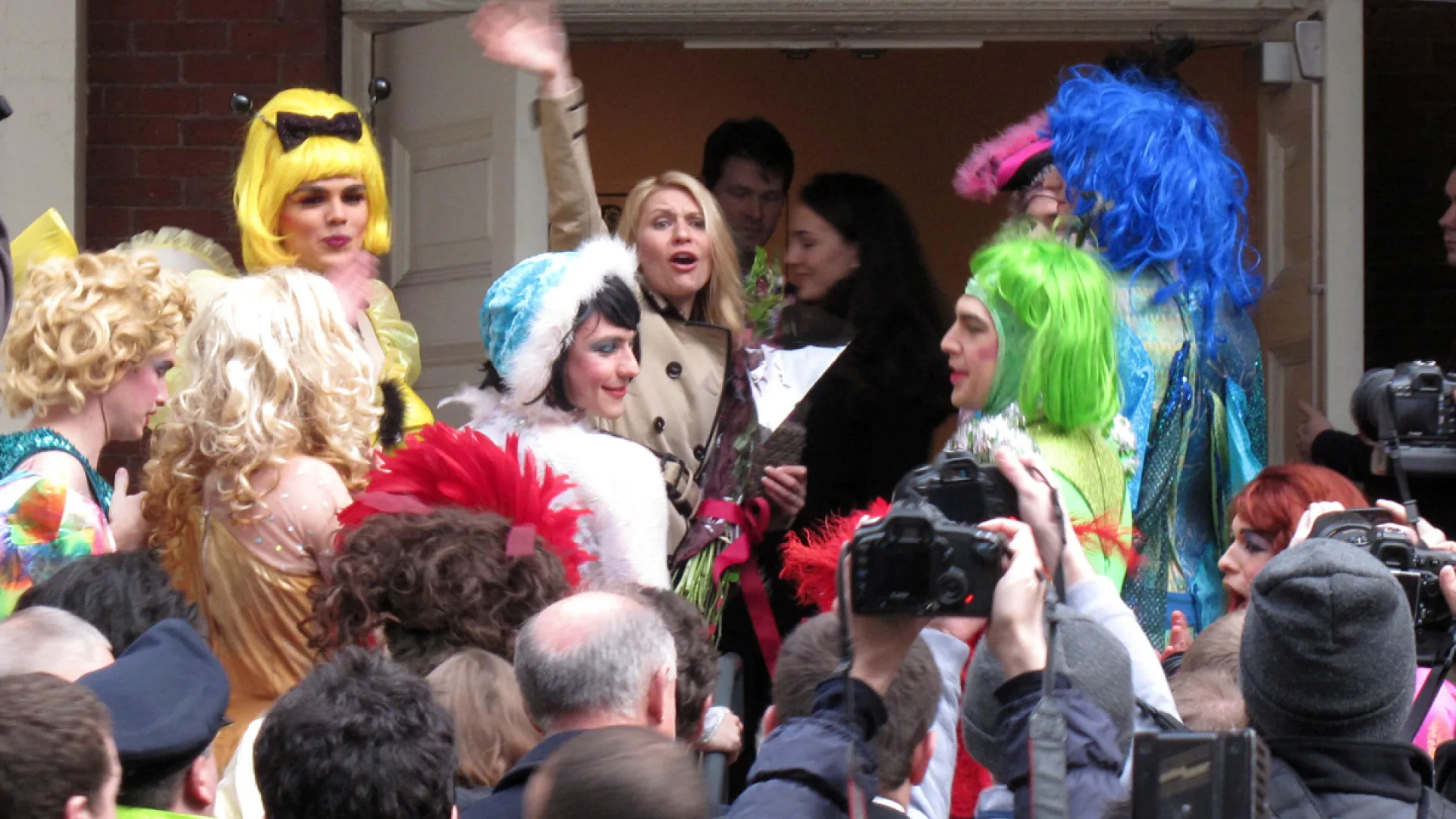 Showered with teddy bears, flowers, and kisses from members of Hasty Pudding Theatricals, actress Claire Danes paraded through Harvard Square today as she was honored as the eccentric drama group’s “Woman of the Year.” Danes, who just won a Golden Globe for her portrayal of Carrie Mathison on the hit Showtime series Homeland, waved and smiled to an animated crowd gathered on Massachusetts Avenue before entering Farkas Hall, where she accepted her Pudding Pot.