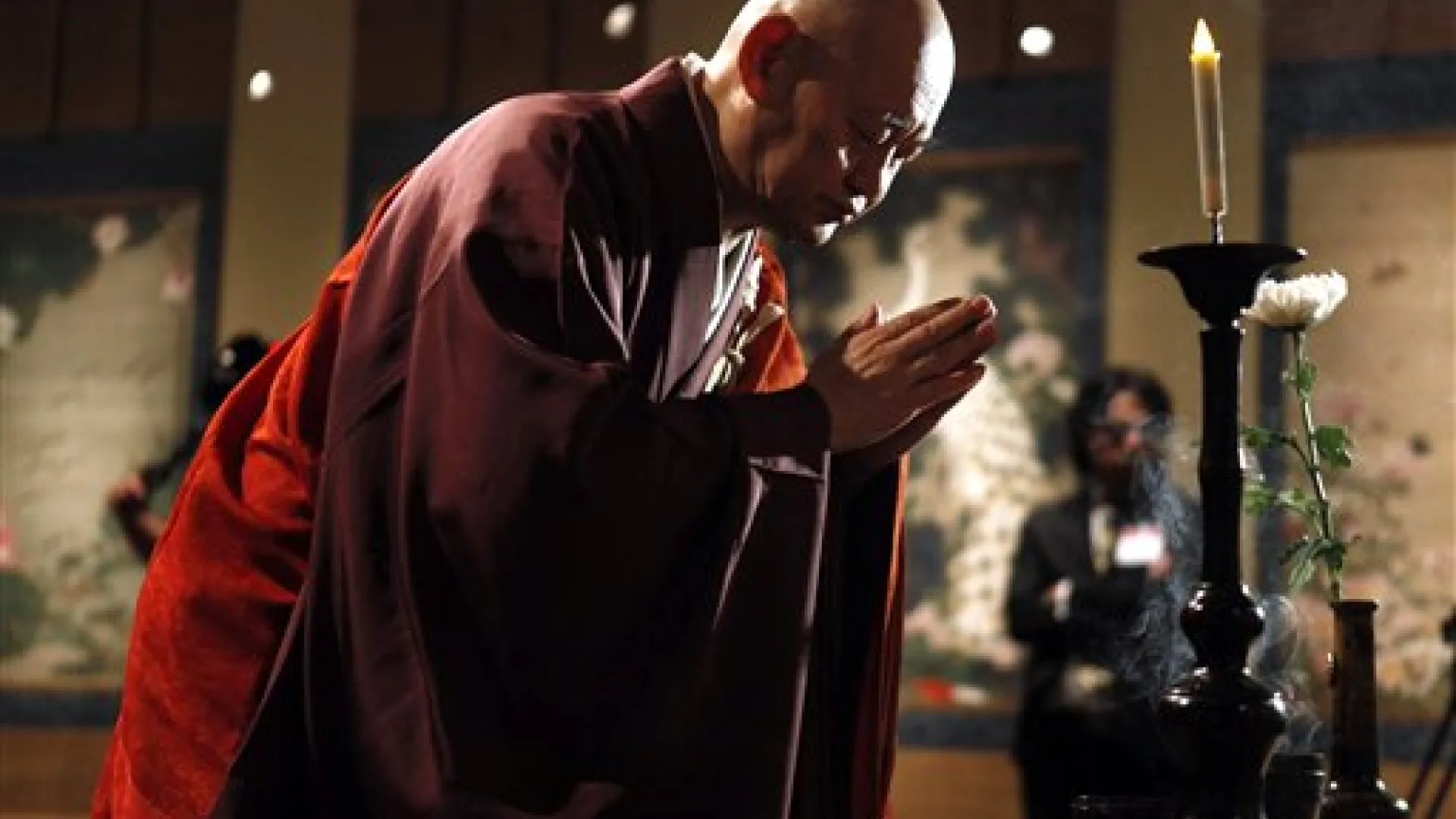 The monastery was Jakuchū’s spiritual home during his lifetime, and on March 26, Buddhist monks from Shōkokuji traveled to the National Gallery to bless the paintings as they began their time in the United States. A small altar in front of the triptych held a simple pot of incense, a vase with a single chrysanthemum, and a steady candle. The weighty smell of beeswax and pine filled the gallery as the monks offered prayers to Kannon for the comfort of Jakuchū’s soul and for peace in the world. The superintendent of the monastery, Reverend Raitei Arima, clad in robes of carmine and purple, bowed his head to the floor before the altar, and one of the monks repeatedly struck a bell that keened shrilly over the low chanting of liturgy; another murmured the text of the Heart Sutra in scriptural Chinese: