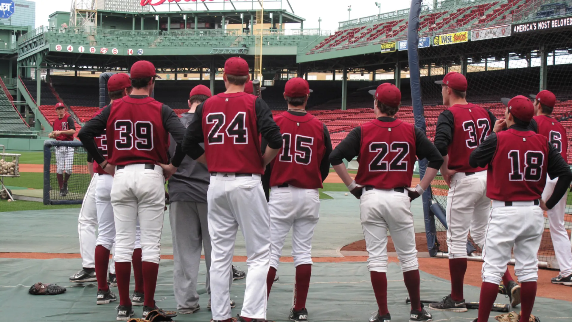 One century to the day after that contest, the Harvard baseball team again trotted out onto the field at Fenway, this time to celebrate the centennial with an extended session of batting practice at the invitation of the Red Sox, who were playing a road game in Toronto. The Harvard athletes had a blast—and hit a few, as well, sending some shots over the towering left-field Green Monster and rattling even more off it. The Crimson squad even got a taste of life in “the show,” as local media covered the occasion: The Boston Globe ran an account the next day, and a television reporter from New England Cable News interviewed Harvard players and head baseball coach Joe Walsh. The JumboTron screen displayed pictures from the history of Harvard baseball, and the left-field scoreboard, showing “Harvard” as the visiting team, gave the line score of that April 9, 1912 game—all seven innings of it.
