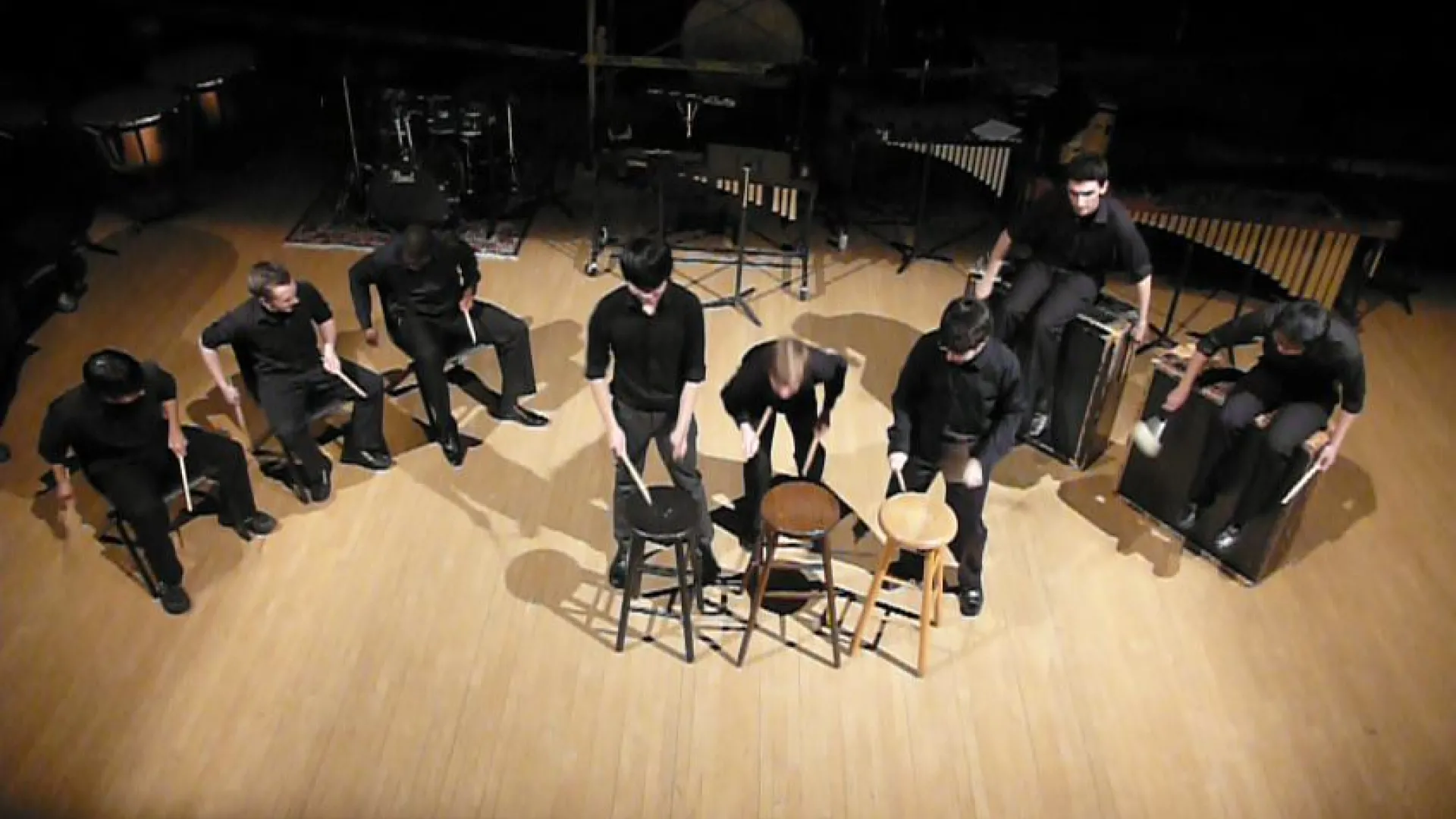 Booming drums, tapping drumsticks, the falling-water roll of a xylophone, the piercing chime of a glockenspiel. Hands beating on music stands, singing and shouting voices, drumsticks on the floor, desks, chairs, doors, each other, anything. In short: cacophony. It's not always easy to tell when THUD is rehearsing actual pieces, as opposed to spontaneously beating out rhythms on anything and everything in sight.
