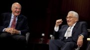 Nye raised the subject of Kissinger’s most recent book [On China, 2011] and its attempt to refute the view of inevitable conflict between the United States and China. Kissinger remarked, “If statesmen in 1914 had known what the world would look like in 1919, would they have gone to war, considering the cataclysmic impact of that war? The answer is pretty clear.” He added, “In a nuclear-armed world, to deal with international relations purely in terms of conflict is inadequate. It is particularly true of China and the United States. Both nations are subject to isolation. We are, because of geographic isolation, and China because they have long been the dominant country in their region. China and the United States recognize that they live in a world of great danger. But some problems, like the environment and climate change, can only be dealt with on a global basis. State leaders on both sides have to make a decision, before they get into these crises, of working on cooperative solutions.”