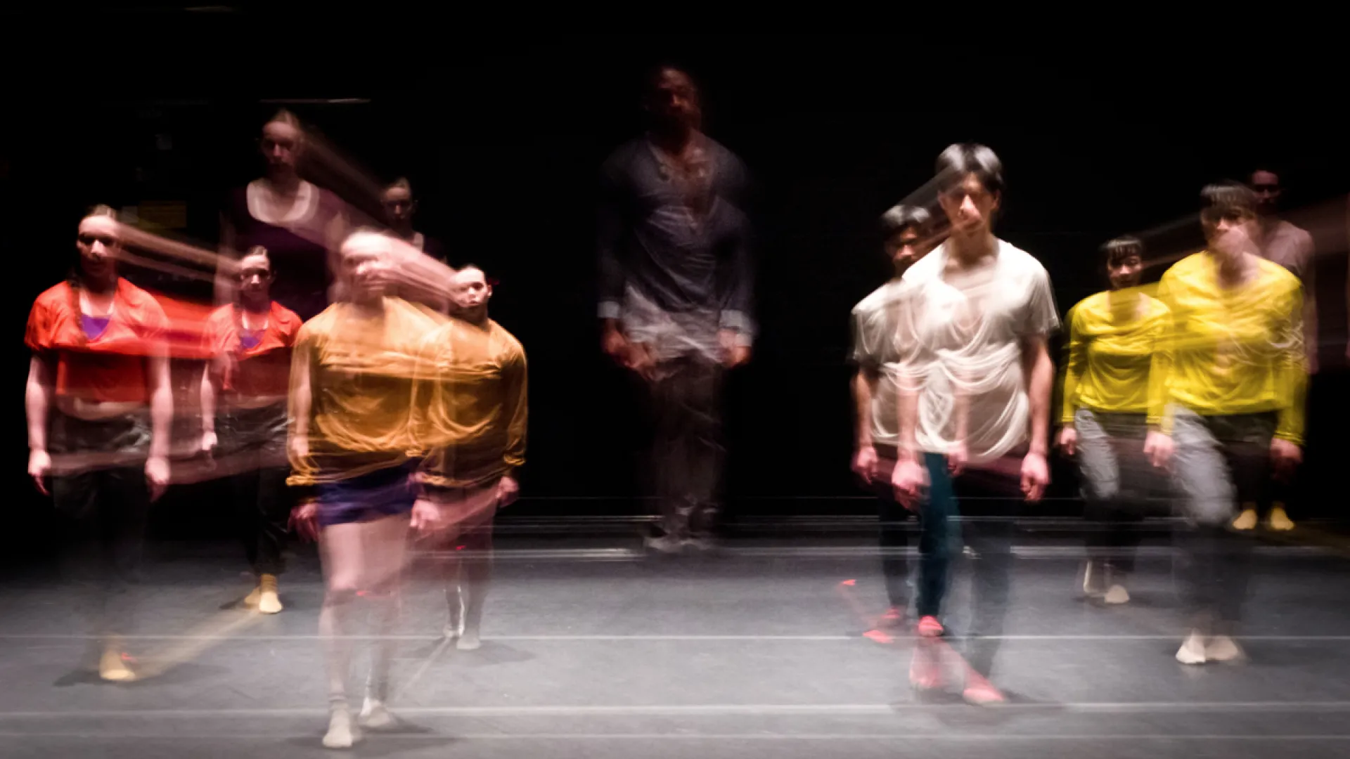 In one scene, the pitch-black auditorium reverberates with the desolate sound of a droning sonar—and nothing else. In another, headphoned dancers wiggle onto the stage, gyrating their bodies to songs on their iPods, lost in their own worlds of music. In a third, off-stage doors slam as dancers march across an open floor, pausing one by one to shout out expressions such as, “Is this it?”