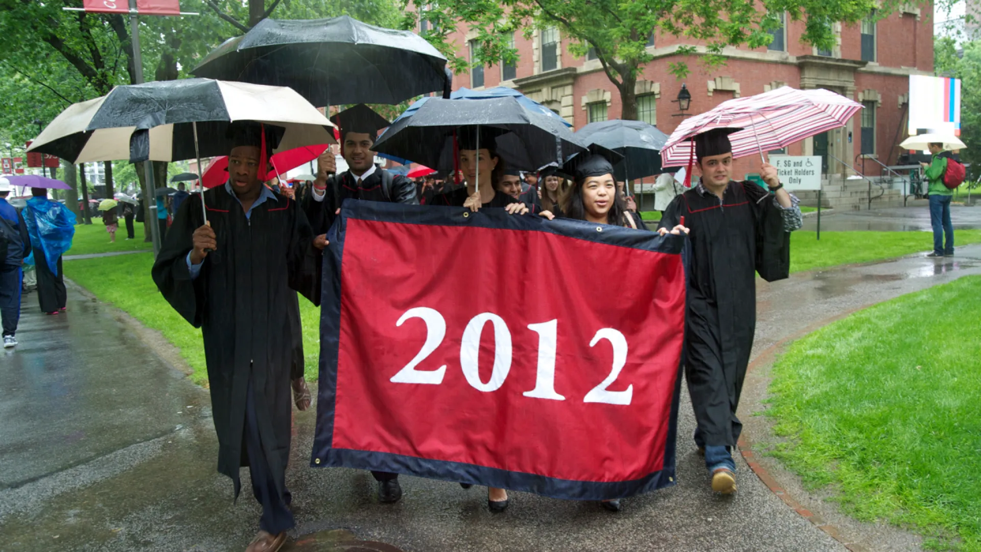 “So go, extraordinary and lucky class of 2012,” Faust said in closing. “Be mindful of your good fortune….Find something you are not looking for.” She entreated the graduating seniors to keep in touch, delivering her final punchline of the day and alluding to the Harvard baseball team’s now-viral video of team members lip-syncing to a smash-hit pop song: “Write. E-mail. And don’t forget to call me…maybe.”