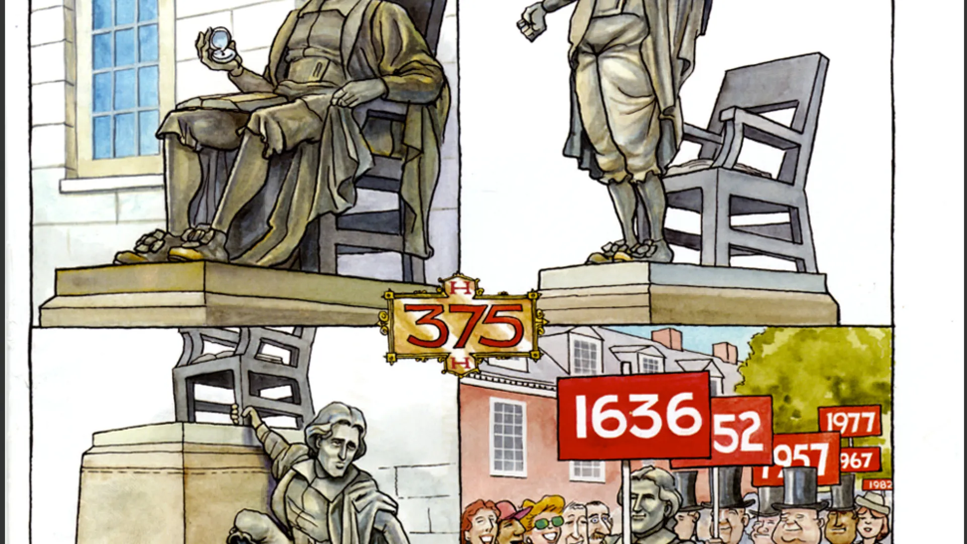 The normally sober and strait-laced Harvard Gazette, the University's official news publication, had a little fun with the cover of its Commencement issue, celebrating Harvard's 375th anniversary. Editorial cartoonist Kevin Patrick Kallaugher '77 (KAL), regularly featured in The Economist and The Baltimore Sun, rendered the John Harvard statue rising from its pedestal to lead the annual alumni parade, representing the infant College of 1636 (before there was, or could have been, a graduating class). This is, of course, his thirty-fifth reunion year.