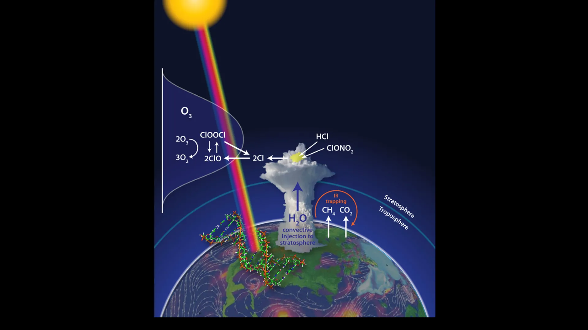 The ozone layer blocks a large fraction of the sun’s ultraviolet light from reaching the earth, protecting life forms from potentially damaging radiation that in humans can lead to skin cancer. But stratospheric ozone is susceptible to chemical catalysts of manmade origin, such as chlorine and bromine, which are present in the earth’s atmosphere as a result of the formerly widespread commercial use of CFCs. And the chemical reactions that destroy ozone are highly dependent on both atmospheric temperature and the presence of water vapor.