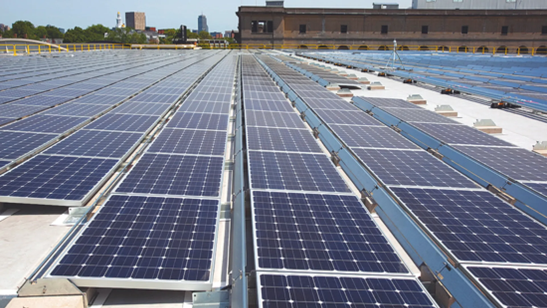 Have 1.5 acres of flat roof space, will go solar. Borrego Solar Systems installed 2,275 solar photovoltaic panels (Harvard’s largest campus solar array) atop the Gordon Indoor Track and tennis complex, creating 591.5 kilowatts of clean- energy capacity. According to the University news release, the investment is expected to have a six- to 10-year payback.