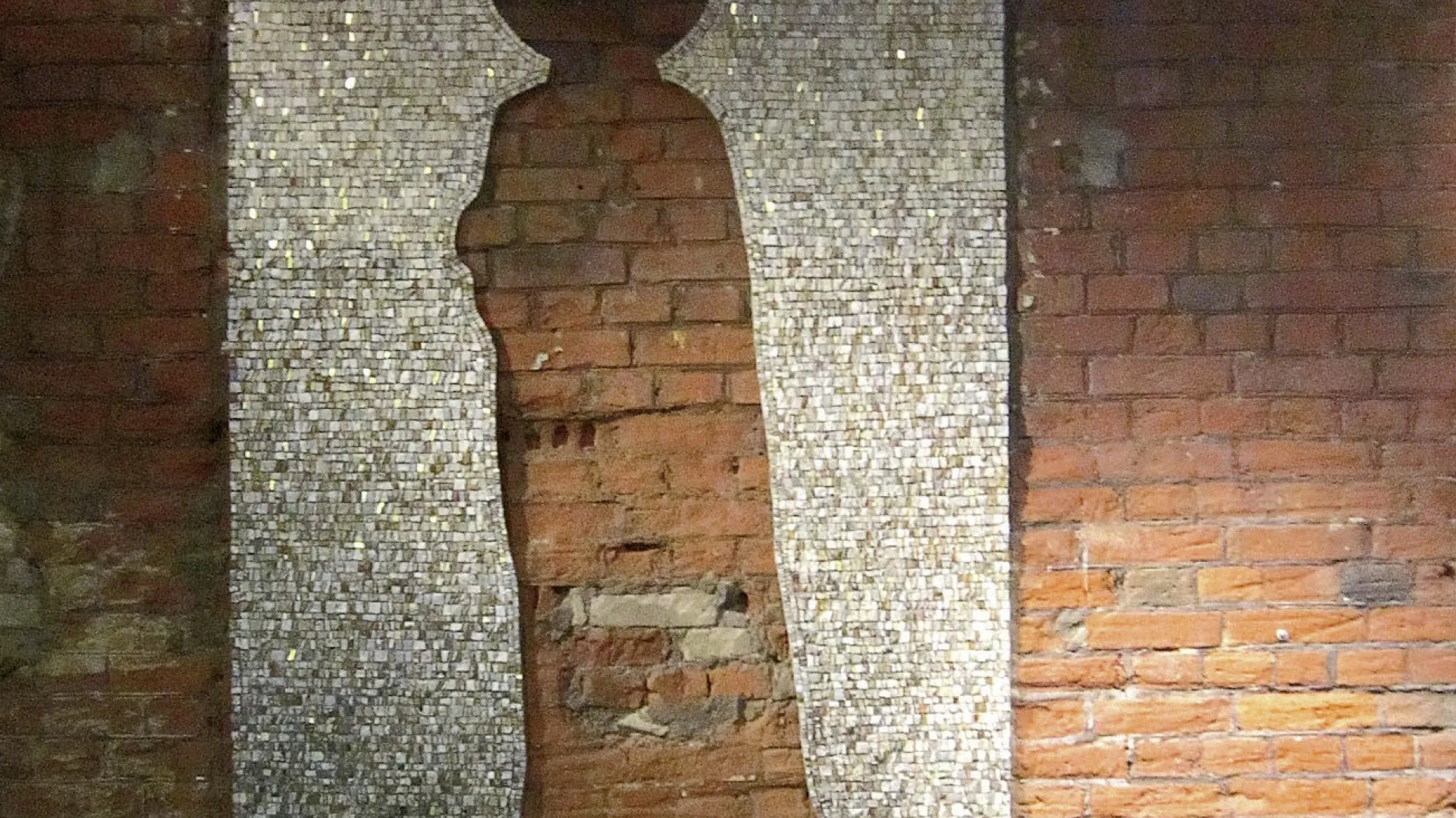 She can, however, work in traditional media, and made her most recent piece, Absence, from small fragments—tesserae—of marble and glass, with gold elements. Holmes installed it last October on a brick wall at the ARTPLAY Design Center, an old, now converted, factory building in Moscow. Absence is the converse of a classic mosaic portrait of a saint of the Church: the piece limns the outline of the saint’s body and haloed head—but there is no saint. The brick wall behind is all that appears in the space where we anticipate a sacred figure. “The saint is only a delineated absence,” Holmes says. “The piece asks the viewer to fill it in—according to whatever belief structure they want to use. It evokes the desire we have to fill in that space.”