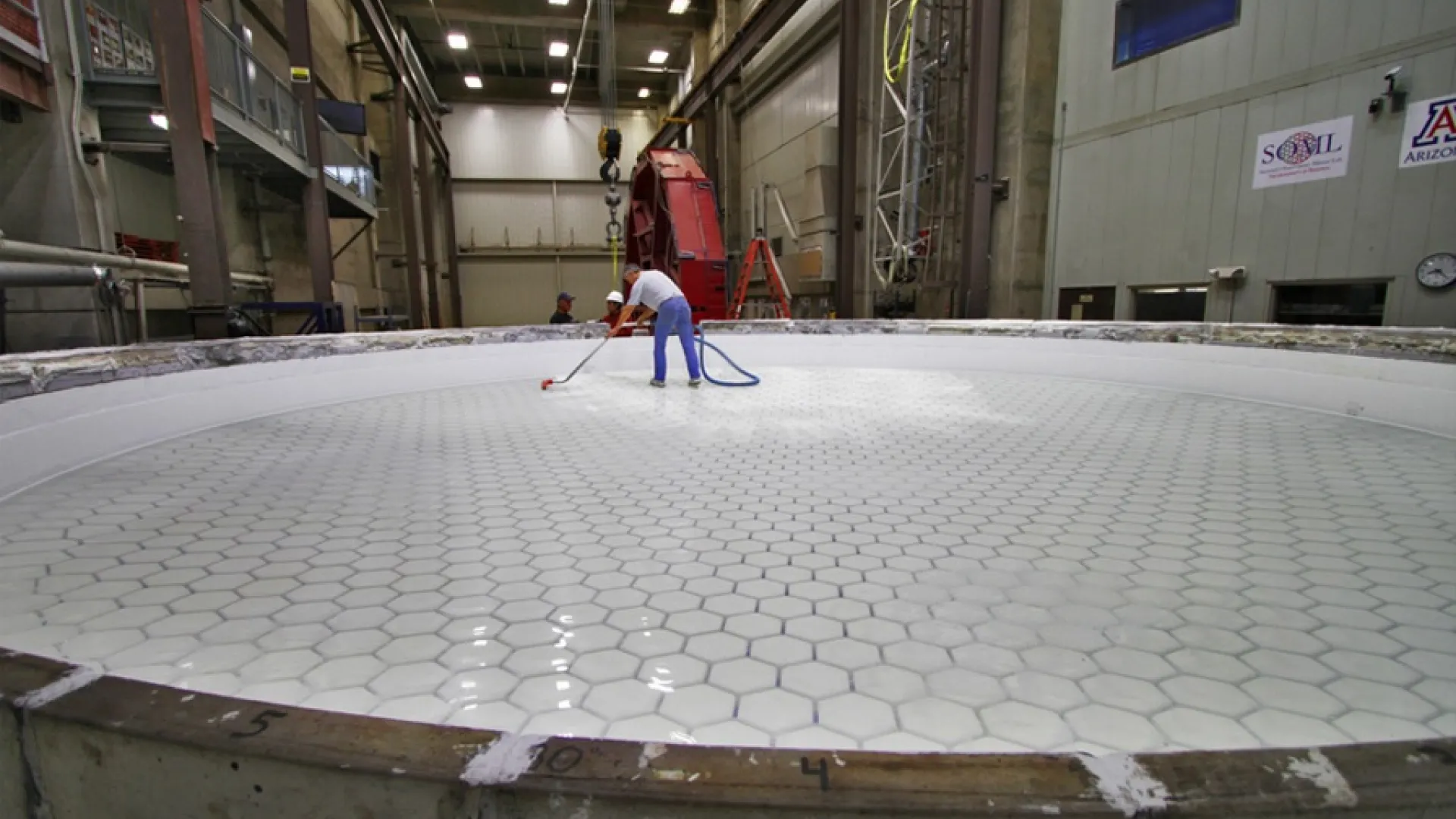 The Steward Observatory Mirror Lab (SOML) has pioneered the technology of casting specially engineered glass in enormous rotating kilns, shaping the mirror blanks so that grinding and polishing to meet optical specifications required for astronomical science—for the GMT, to tolerances of 20 to 25 nanometers, about one-twentieth of a wavelength of green light—can be minimized. The mirror blanks are shaped atop exactly contoured hexagonal columns of refractory material. That results in blanks that, when cooled and cleaned, have a honeycomb back surface: strong, stable, far lighter than solid glass, and able to be brought quickly to the ambient air temperature each night when astronomers use the telescope. (SOML maintains excellent online resources that describe the mirror-making processes, and the preparations for casting the third mirror this past weekend.)