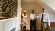 But the renovation that will likely make the greatest change in community life within this renewed part of Quincy House is the reclamation and repurposing of the basement level. This improvement also brings core academic activities into the House: the state-of-the-art smart classroom, complete with Mondopads and document cameras, was championed by Michael D. Smith, dean of the Faculty of Arts and Sciences (FAS), who is a member of the HarvardX leadership committee and a member of the board of directors of edX. He particularly enjoyed a demonstration of its capabilities during the tour. The classroom (already reserved for six courses, on topics ranging from DNA transport to French, according to Quincy House master Lee Gehrke, who joined the tour, along with his wife and co-master Deborah Gehrke) has been called the “most versatile room on campus, classroom wise,” said Robert G. Doyle, associate dean of FAS. Students will be encouraged to use it informally to explore its capabilities, Smith said.