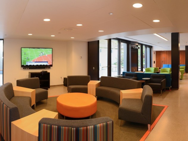 Students will no doubt find the more modern and more private bathrooms an upgrade, and will benefit from the circulation pattern: no more awkward walking through fellow students’ spaces to get somewhere. With sofas and ottomans in the common spaces, they are freed from schlepping furniture up and down flights of stairs at the beginning and end of academic years. And the inhabitants of the clustered bedrooms on the second and third floors will find the College-supplied flat-screen TVs hung over fireplaces in common rooms—with convenient connections for laptops or game consoles—a prestigious way to avoid studying. Everyone will be able to take advantage of the wireless printers installed in nooks behind the fireplaces.