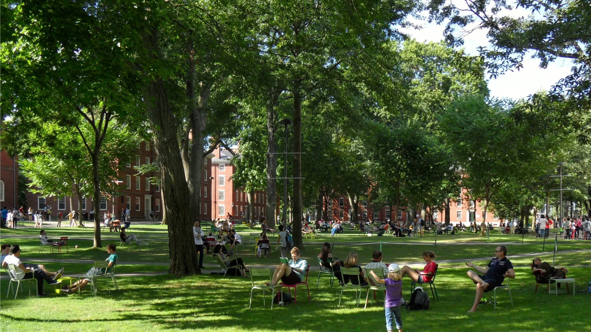 Summer-school students and visitors, including families, enjoy the shaded lawns of Harvard Yard. The chairs, first installed in 2009 as a project of the Steering Committee on Common Spaces, have transformed the Yard into a social gathering place.
