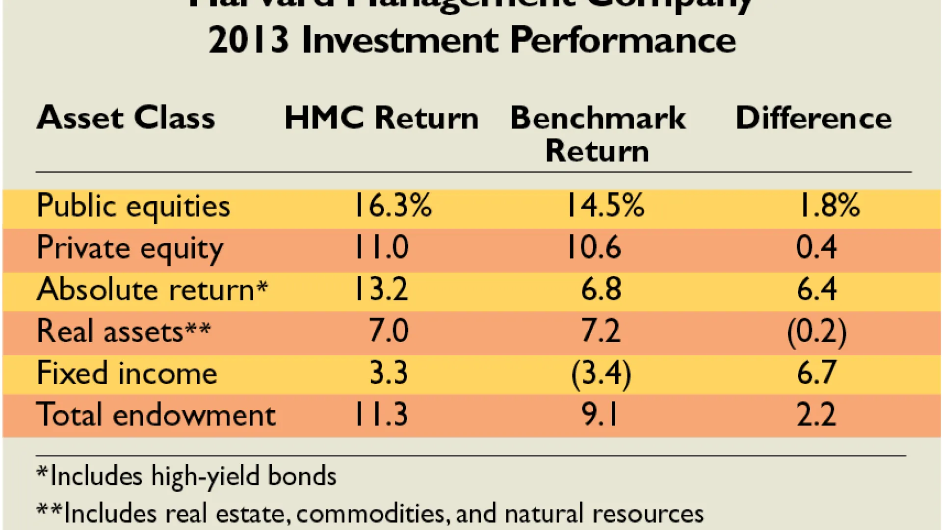 HMC’s 11.3 percent reported rate of return on investments exceeded the 9.1 percent return calculated using market benchmarks for the assets in the “policy portfolio”—the management company’s model for allocating funds among various categories such as stocks, fixed-income instruments, real estate, and so on. (See the 2013 policy portfolio here.) This is the fourth consecutive year in which HMC’s results exceeded the benchmark returns.