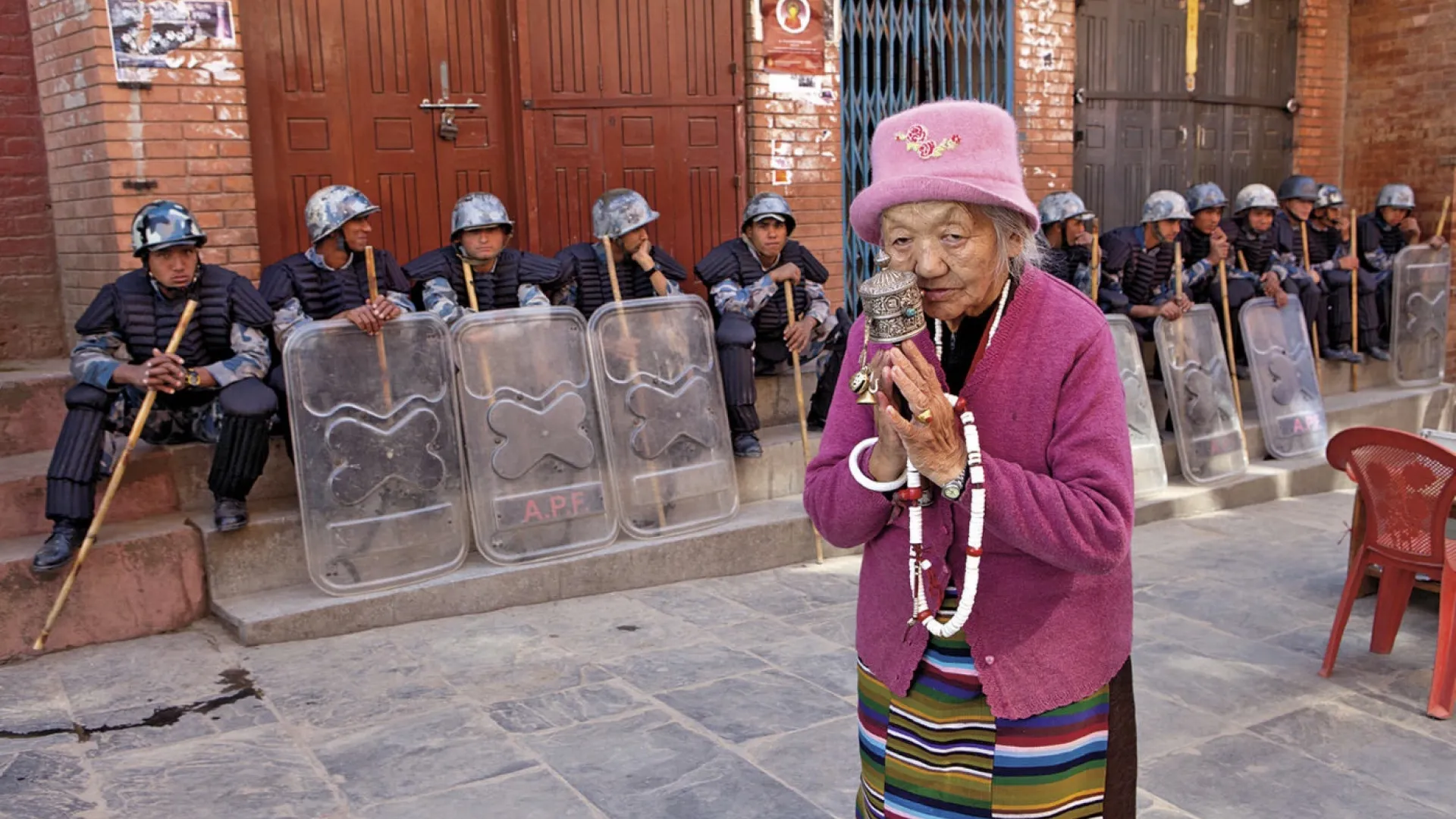 When last in Nepal in 2011, on the Tibetan New Year, Bubriski saw other signs of change while visiting the Boudhanath Stupa, a pilgrimage site for Tibetan Buddhists living in Kathmandu. In the past, people gathered there, perhaps to “throw roasted barley flour in the air and cheer for the new year and the long life of the Dalai Lama,” he explains, but “any political expressions at the Stupa are forbidden now.” He was moved to see one elderly woman in a soft pink hat circumambulating the monument, holding a prayer wheel and rosary beads (above), and framed the moment she passed Nepali policemen in full riot gear waiting, he says, “for a call to action.”