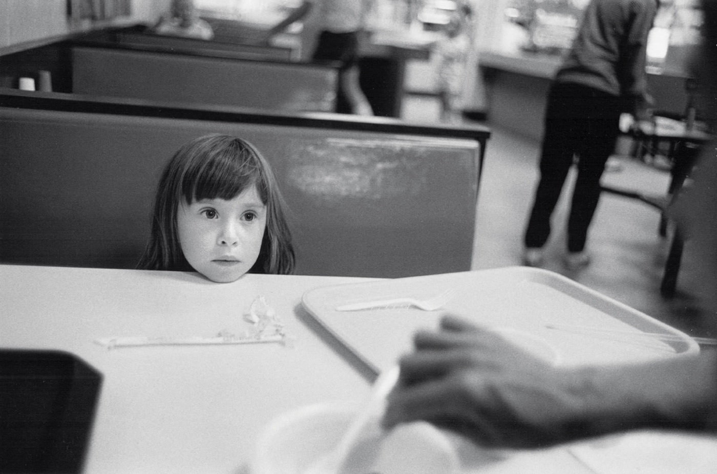 Another product of Biddle’s exploration of family resides on his website, geoffreybiddle.com, on a page titled “Family.” There, the viewer finds 17 black-and-white images produced between Eve’s birth, in 1982, and 1991. All but one feature Eve: with her mother, father, or occasionally both parents, and at times with Geoffrey’s parents, a family friend, or a hired caregiver. In one, Eve is in the foreground and her grandmother in the background, both out of focus. The only object that is sharp and clear is a framed fifth-grade photo of Geoffrey. “Eve had gone upstairs to wake my mother, and she asked her grandma about that picture, which was on the dresser. I saw the opportunity to make a three-generation photograph without actually getting in front of the camera, and I loved that the ages were mixed up: a four-year-old, a fifth-grader, and a grandmother.”