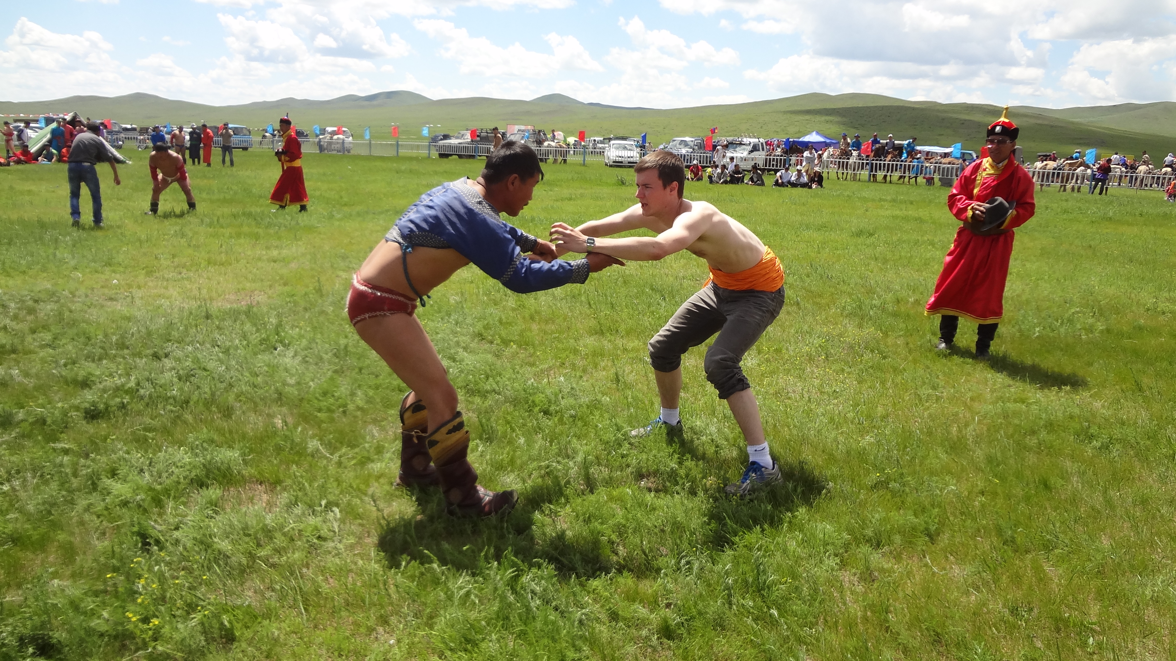 Naadam occurred halfway through my week-long trip. About a thousand Mongolians from a hundred-mile radius attended the local festival where I was (somewhat remarkably given its unmarked location in the middle of the steppe with no roads or other landmarks to identify it), arriving either by Jeep or by horseback. My wrestling debut would happen in front of a crowd of people who had never met a white person before. I had never wrestled in my life, but my host family insisted that, as a young, able-bodied man, I should participate. (I was told that this was a matter of custom, although judging by the number of other young men who chose to sit back and drink vodka with their friends, and the hysterical laughter that overcame my host family, I think this may have been a ruse.) Naturally, I lost the fight. My opponent had 20 years of experience and about a hundred pounds on me; I stayed on my feet for a matter of seconds before being expertly flipped onto my back.
