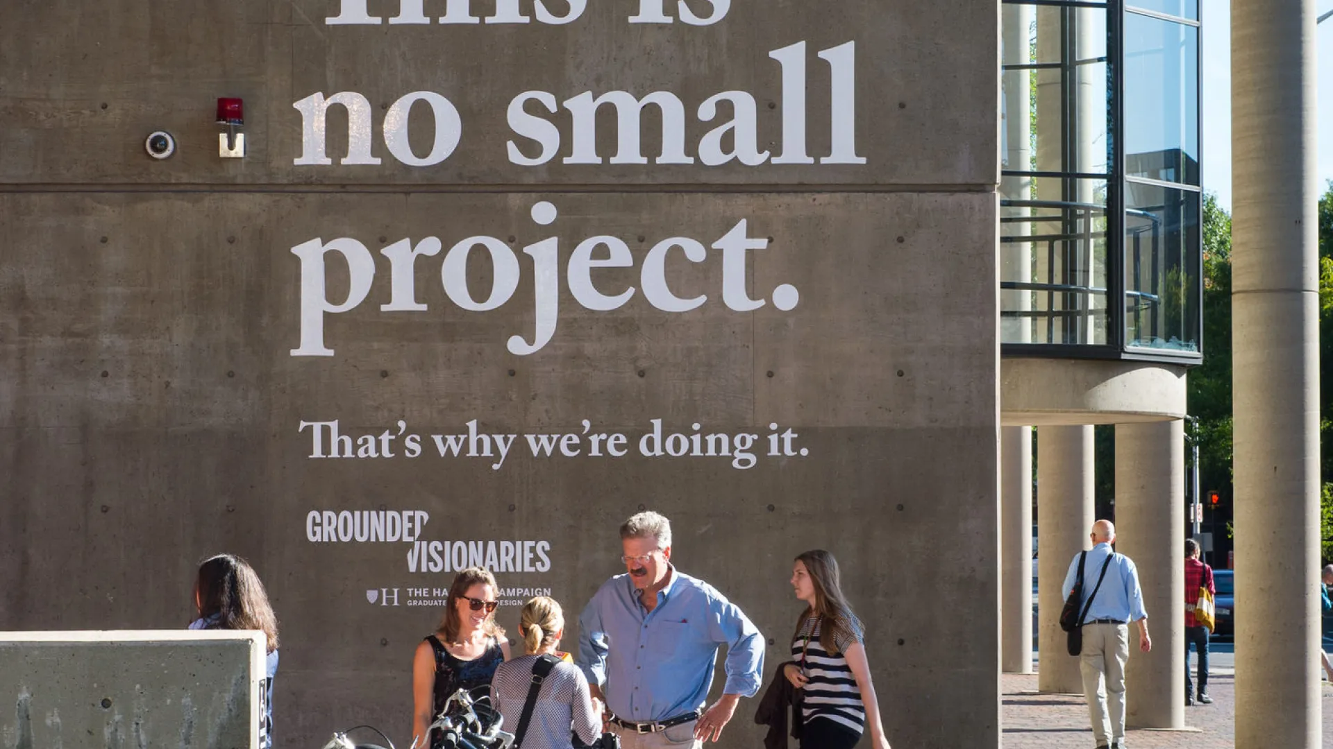The campaign’s launch weekend, though officially tagged an exploration of the school’s “grounded visionaries,” offered a second refrain, a call to arms emblazoned in large white letters on the side of Gund Hall: “This is no small project. That’s why we’re doing it.”
